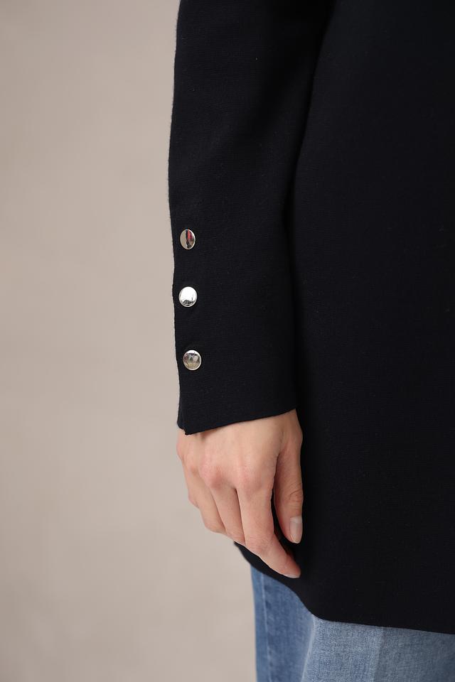 Особенностью модели являются декоративные пуговицы на рукавах, которые добавляют изысканности. Жакет выполнен из качественной вискозы (62%) и полиэстера (38%), что обеспечивает приятные тактильные ощущения и долговечность изделия.