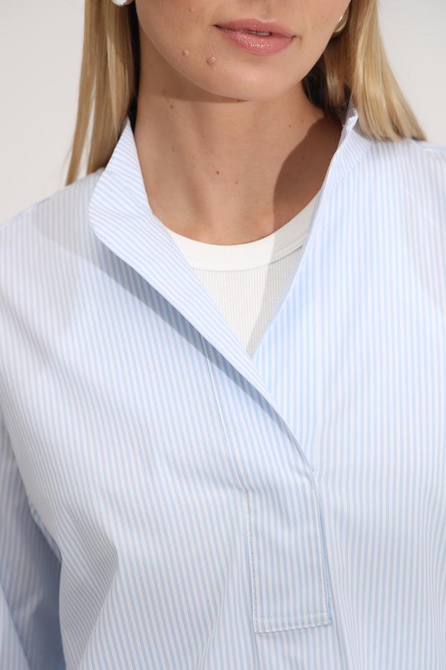 Эта блуза от Gerry Weber станет отличным дополнением к вашему гардеробу. Она выполнена в нежном голубом цвете с вертикальной полоской, что визуально вытягивает силуэт.