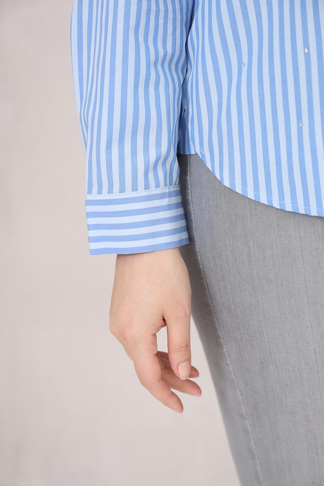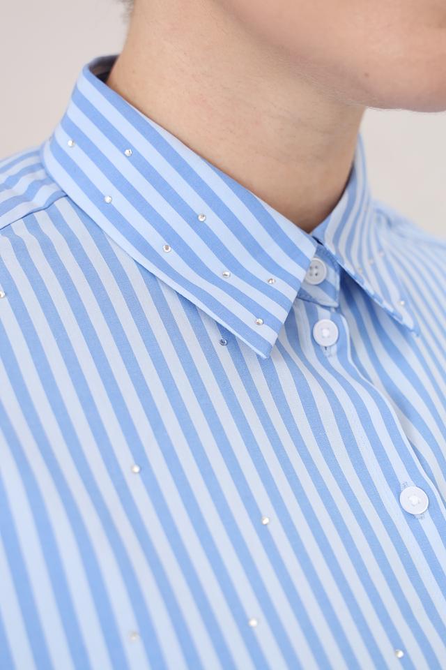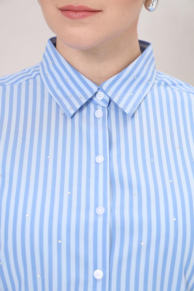 Рубашка имеет классический крой с длинными рукавами и отложным воротником. Застежка на пуговицы по всей длине планки. Особый шарм изделию придают небольшие стразы, аккуратно расположенные на воротнике и планке, добавляя изысканности образу.