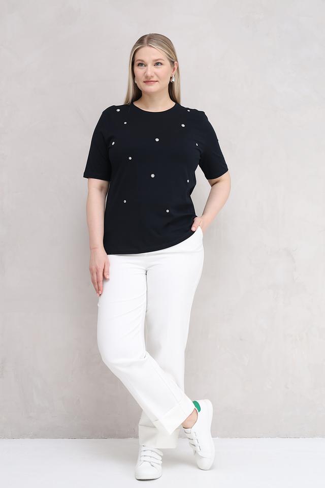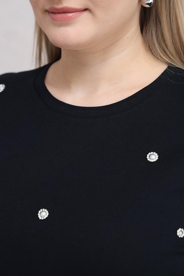 Особенностью данной модели является деликатная отделка из жемчуга, которая придает ей элегантность и изысканность. Футболка имеет прямой крой и короткие рукава, что обеспечивает комфорт в носке.