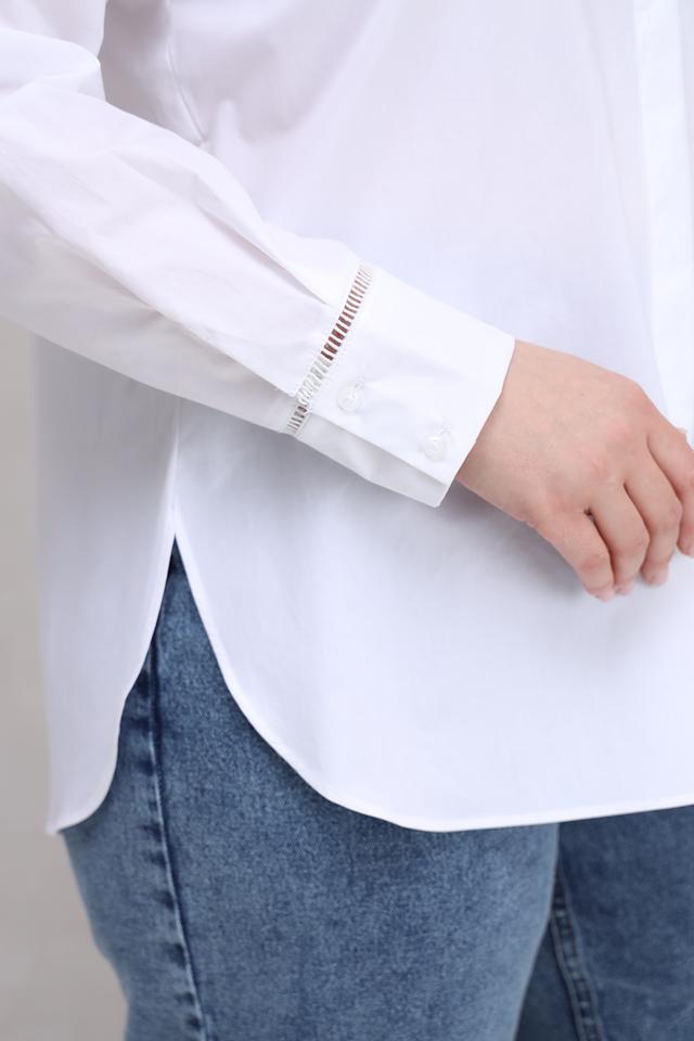 Рубашка имеет свободный крой, который обеспечивает комфорт в носке и позволяет легко сочетать ее с различными предметами одежды – от джинсов до юбок. Декоративные элементы в виде небольших разрезов на рукавах придают рубашке оригинальность и изысканность.