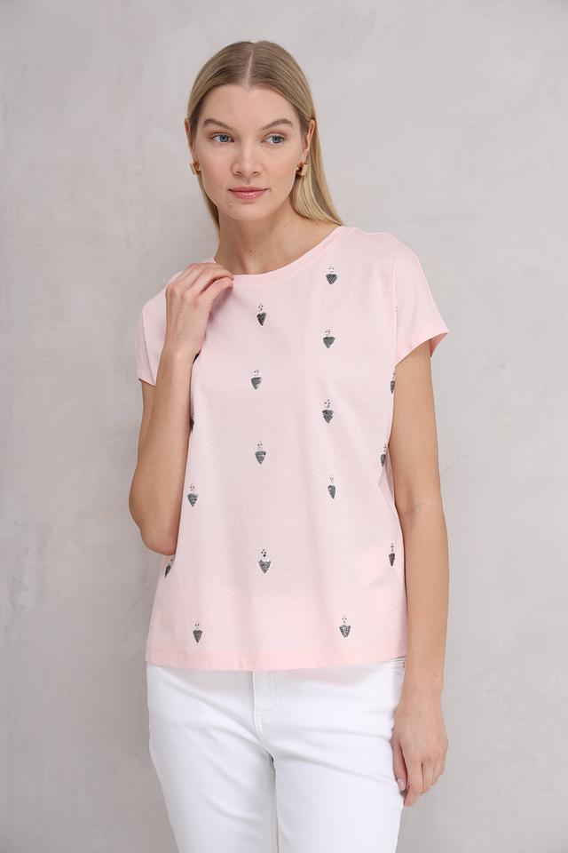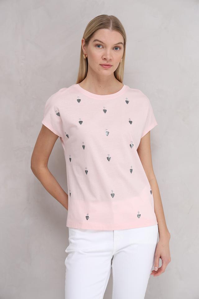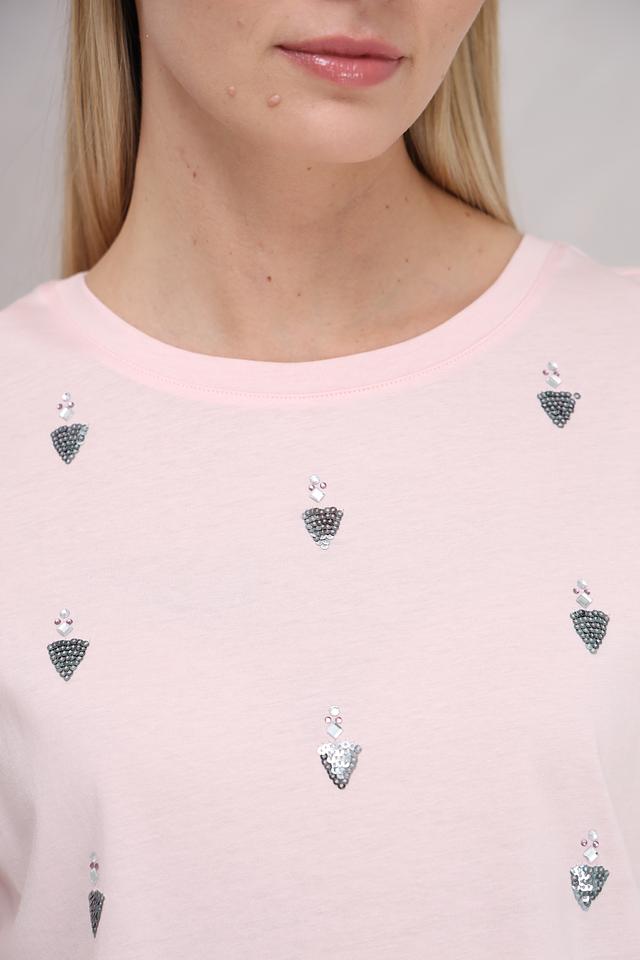 Женская футболка Gerry Weber нежно-розового цвета украшена вышивкой в виде сердечек. Изготовлена из 100% хлопка, обеспечивая комфорт и воздухопроницаемость. Стильный и романтичный образ для повседневной носки. Состав: хлопок 100%