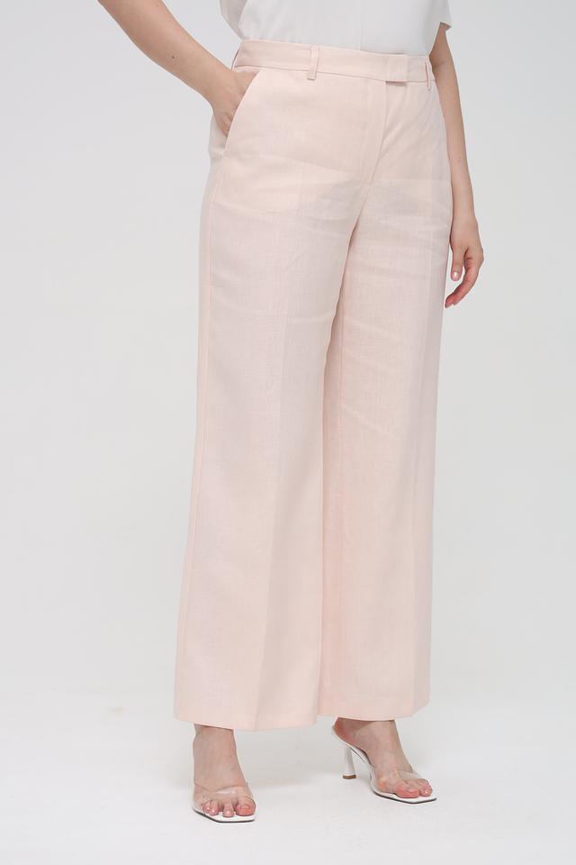 Брюки имеют классический прямой крой и стандартную посадку по талии, что делает их универсальными и подходящими для различных типов фигур. Нежный персиковый оттенок придаёт образу легкость и свежесть.
