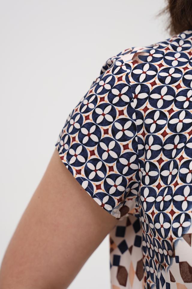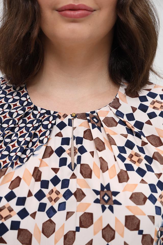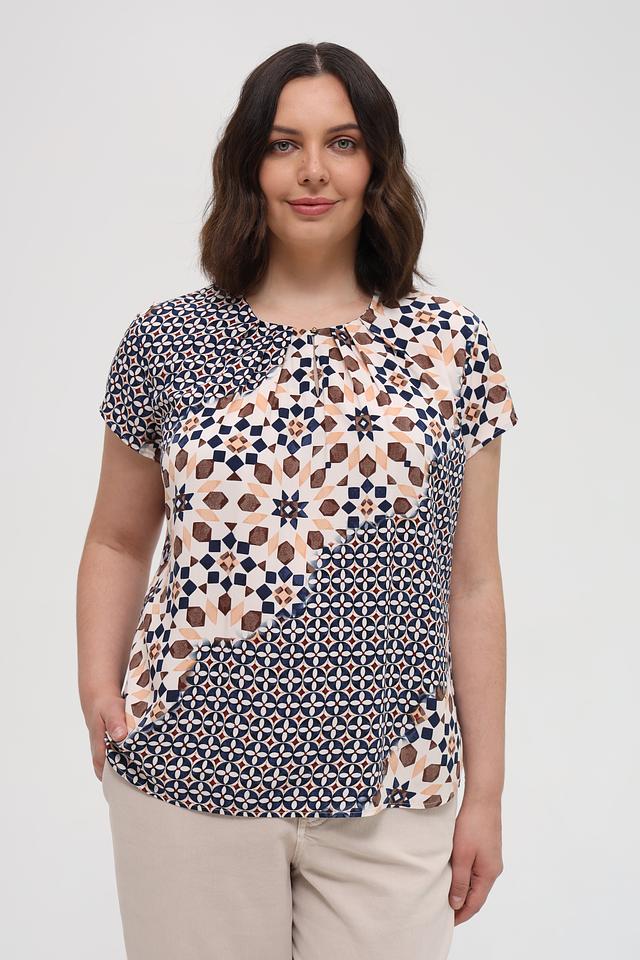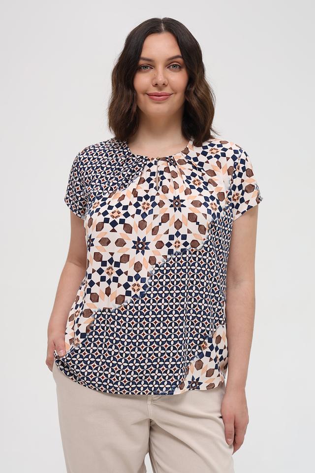 Блуза имеет короткие рукава и округлый вырез горловины, который дополнен небольшими складками, создающими легкий объем. Привлекает внимание яркий геометрический принт, выполненный в сочетании синего, белого и коричневого цветов.