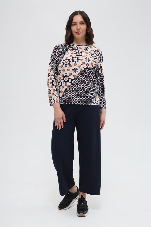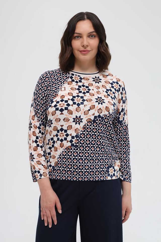 Пуловер имеет округлый вырез горловины и длинные рукава. Его особенностью является яркий геометрический принт, выполненный в бежевых, коричневых и тёмно-синих тонах. Такой рисунок делает этот пуловер уникальным и привлекательным.