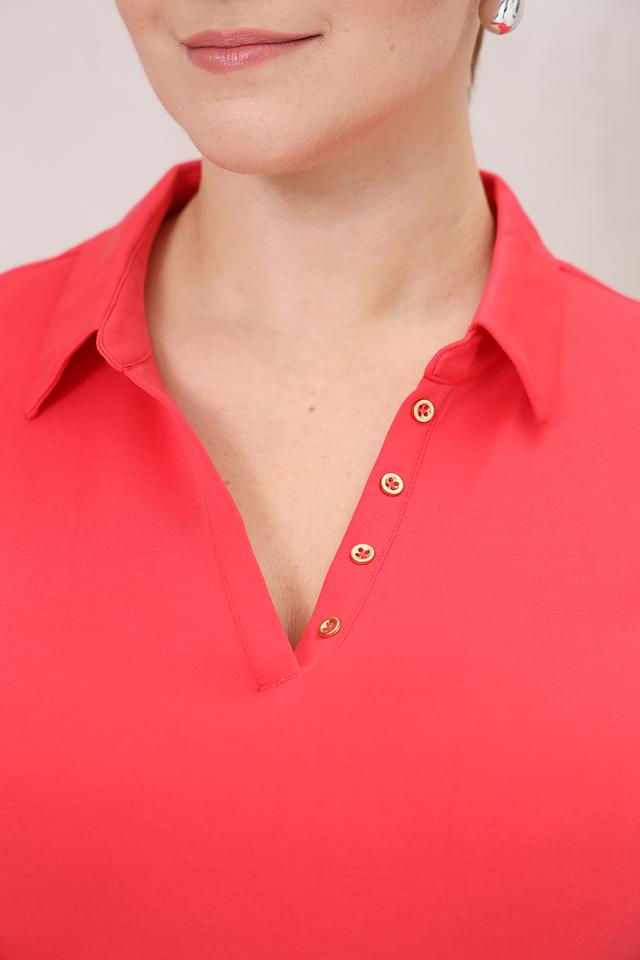 Футболка имеет классический крой с короткими рукавами и воротником-поло. Застежка на ряд пуговиц позволяет регулировать степень раскрытия воротника. Детализированный воротник и аккуратный ряд пуговиц добавляют модели элегантности.