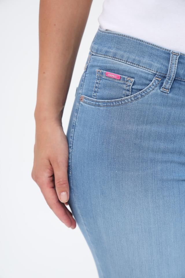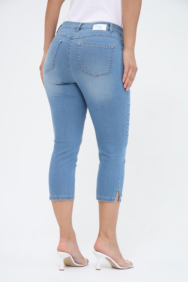 Капри имеют классический голубой цвет и прямой крой, который подчеркивает фигуру. Декоративные элементы в виде аккуратных вышивок на карманах придают им особый шарм. Застежка на молнию и пуговицу обеспечивает надежную фиксацию.