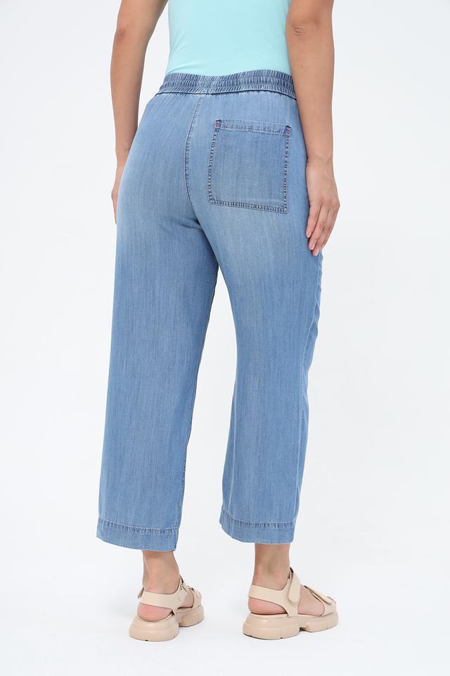 Брюки имеют свободный крой и укороченную длину, что делает их идеальными для теплой погоды. Эластичный пояс с кулиской обеспечивает комфортную посадку и позволяет регулировать облегание. На задней части брюк расположены накладные карманы.
