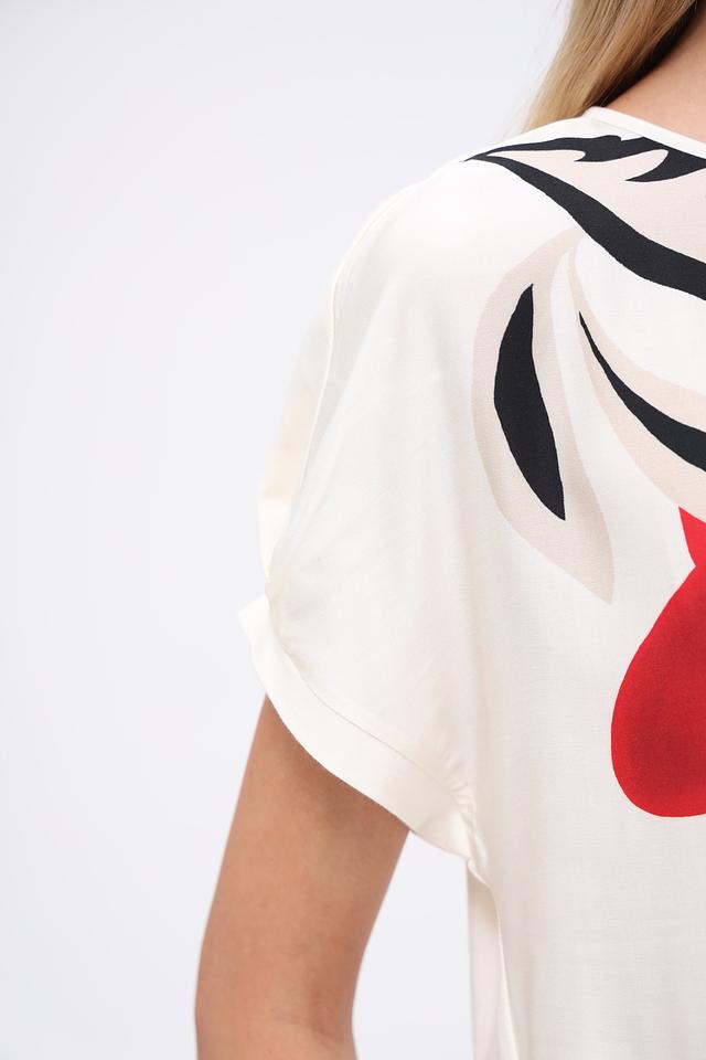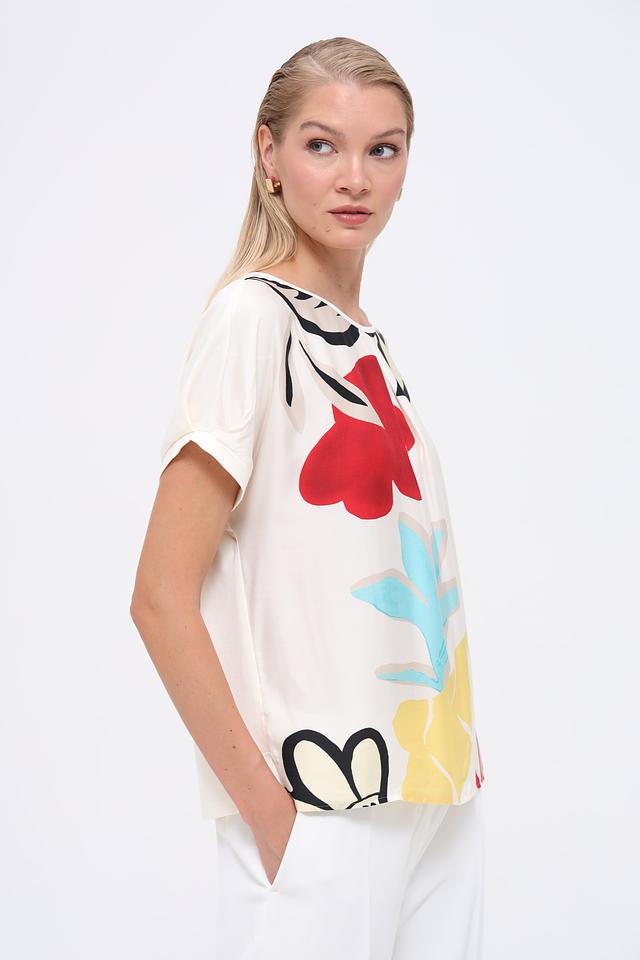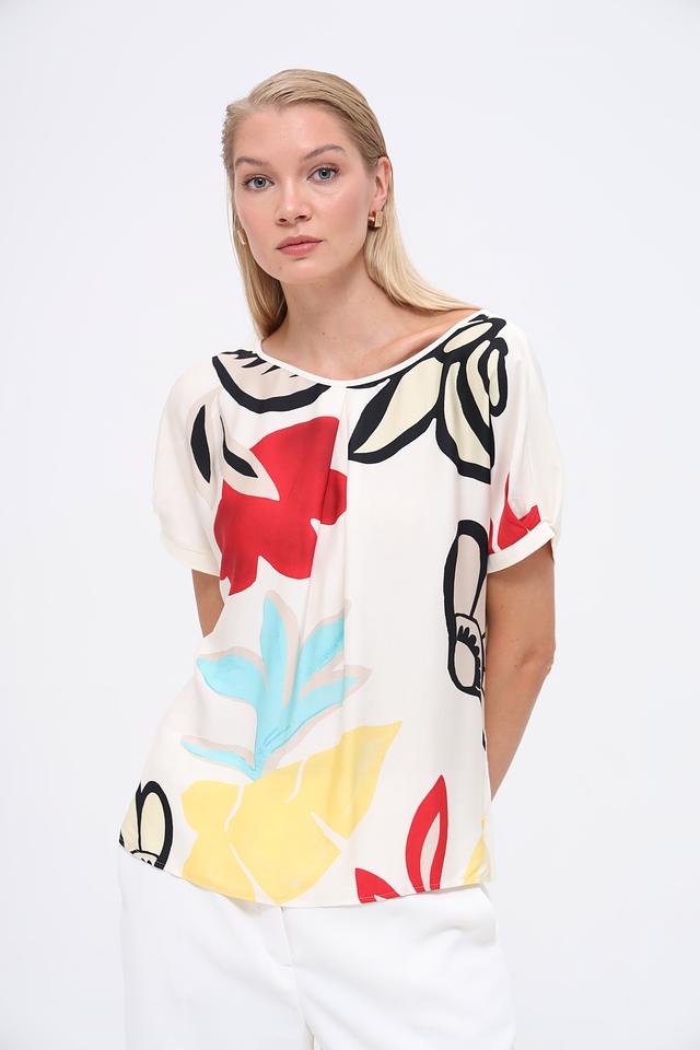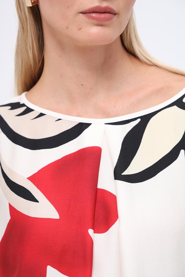 Эта блуза от Gerry Weber – идеальный выбор для создания яркого и женственного образа. Блуза выполнена в кремовом цвете и украшена эффектным цветочным принтом, включающим в себя элементы красного, жёлтого, голубого и чёрного цветов.