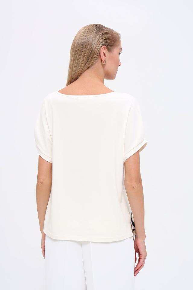 Модель имеет свободный крой, короткие рукава с небольшими манжетами и округлый вырез горловины. Блуза выполнена из приятной на ощупь ткани, состоящей из 47% хлопка, 47% модала и 6% эластана, что обеспечивает комфорт и удобство при носке.