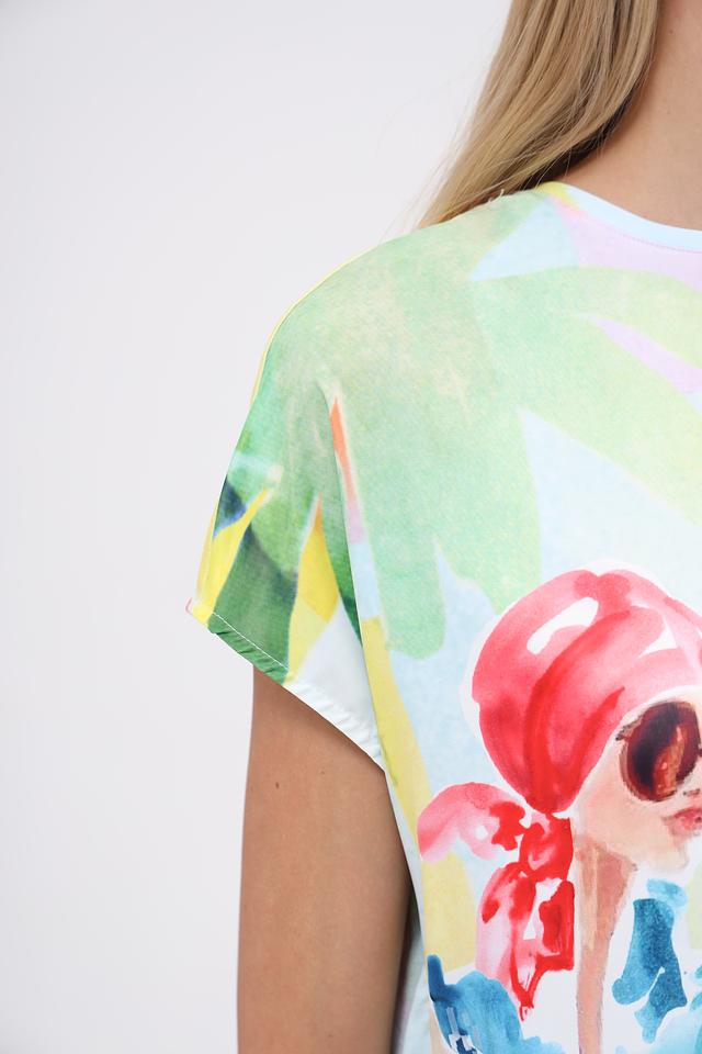 Блуза отличается оригинальным дизайном с красочным принтом, изображающим женский портрет в абстрактном стиле. Преобладающие цвета – розовый, жёлтый, голубой и зелёный, создающие эффектный визуальный образ.