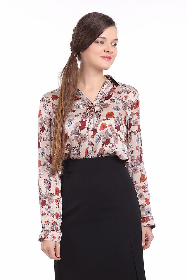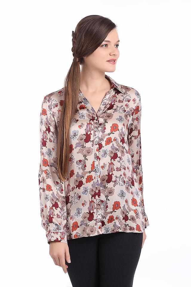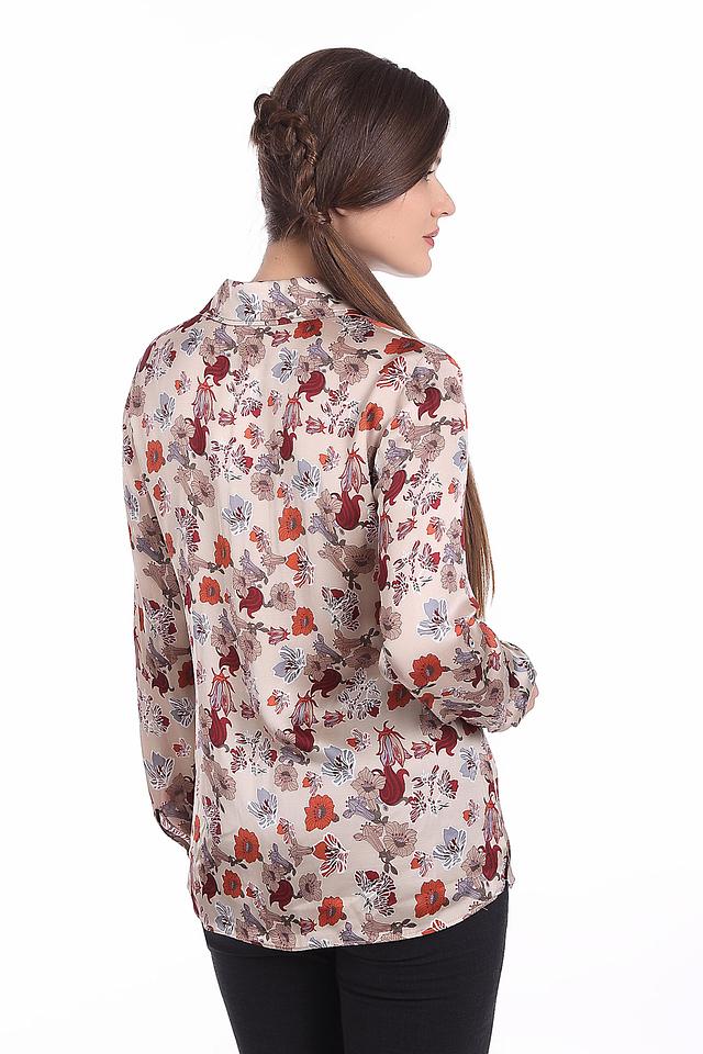 Блуза имеет классический крой с длинными рукавами и отложным воротником. Её украшает яркий цветочный принт, который добавляет образу женственности и легкости. Рукава блузы слегка расклешены к низу, что придает ей романтичный вид.