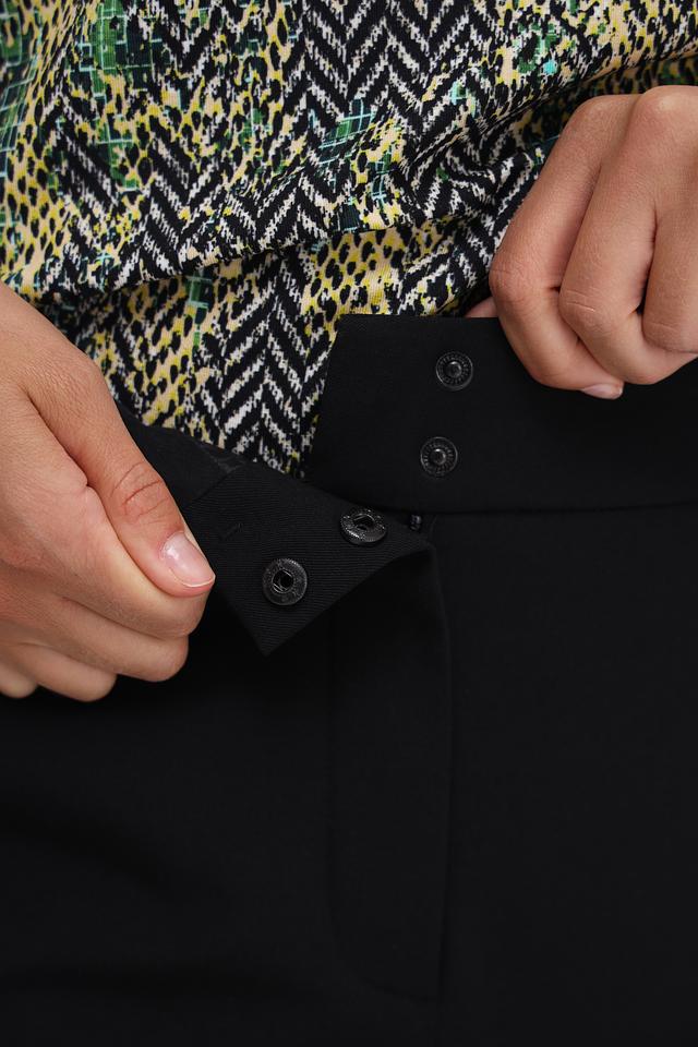 Брюки имеют прямой крой и стандартную посадку по фигуре, обеспечивая комфорт в носке. Застёжка на пуговицы и молнию гарантирует надежную фиксацию. Ткань, состоящая из полиэстера, вискозы и эластана, приятна к телу и хорошо держит форму.