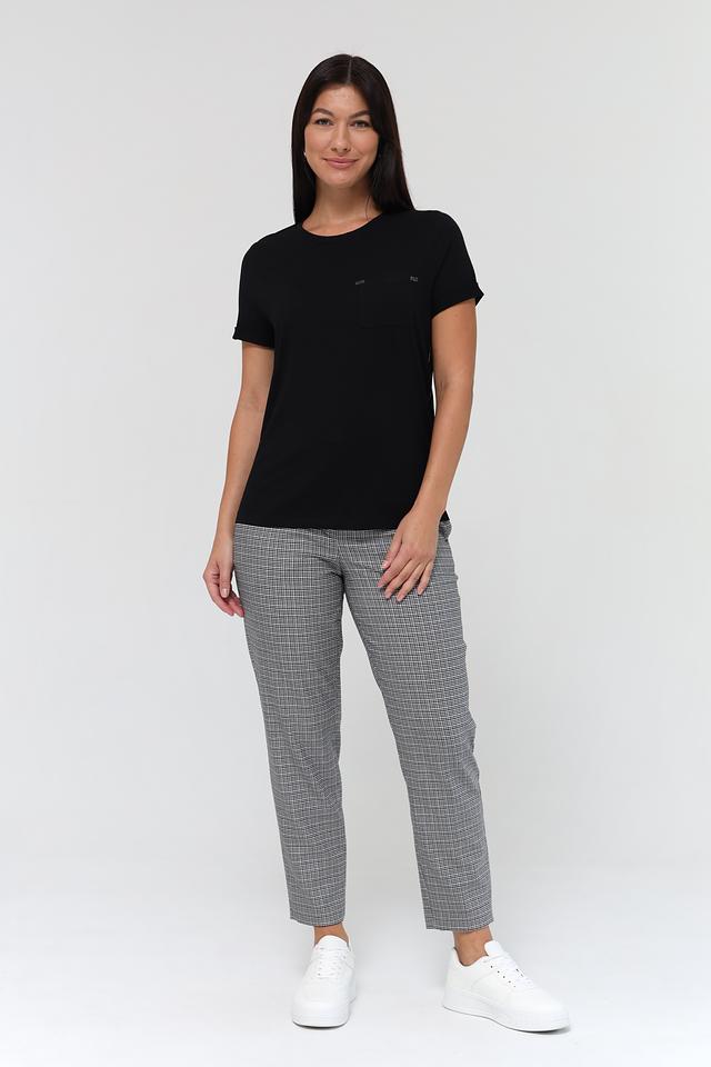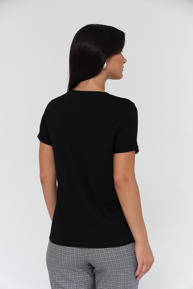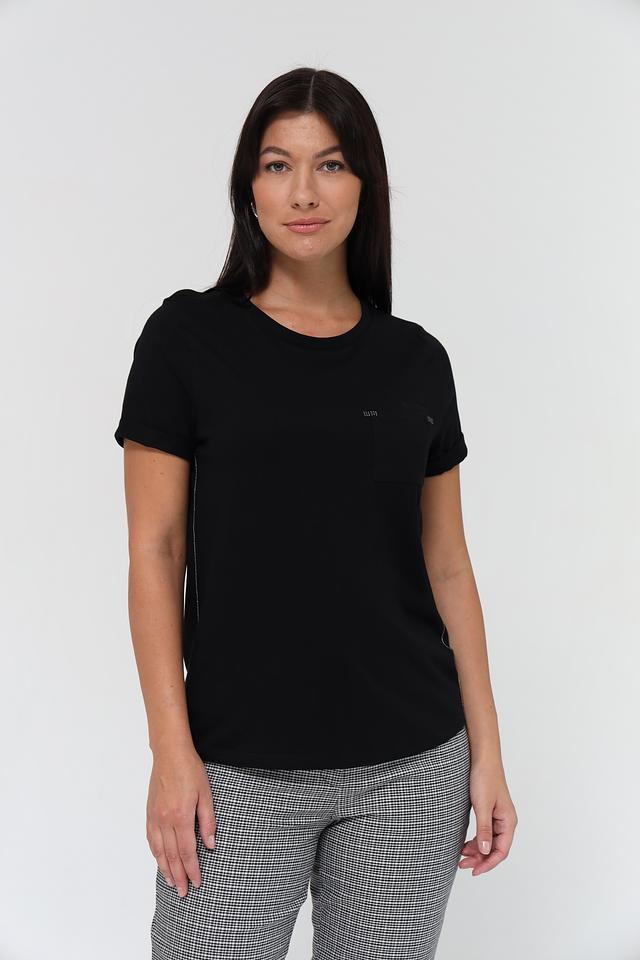 Классический прямой крой футболки подходит для любого типа фигуры. Короткие рукава делают её идеальным выбором для тёплой погоды. На груди и рукаве расположены небольшие декоративные элементы, добавляющие изысканности.