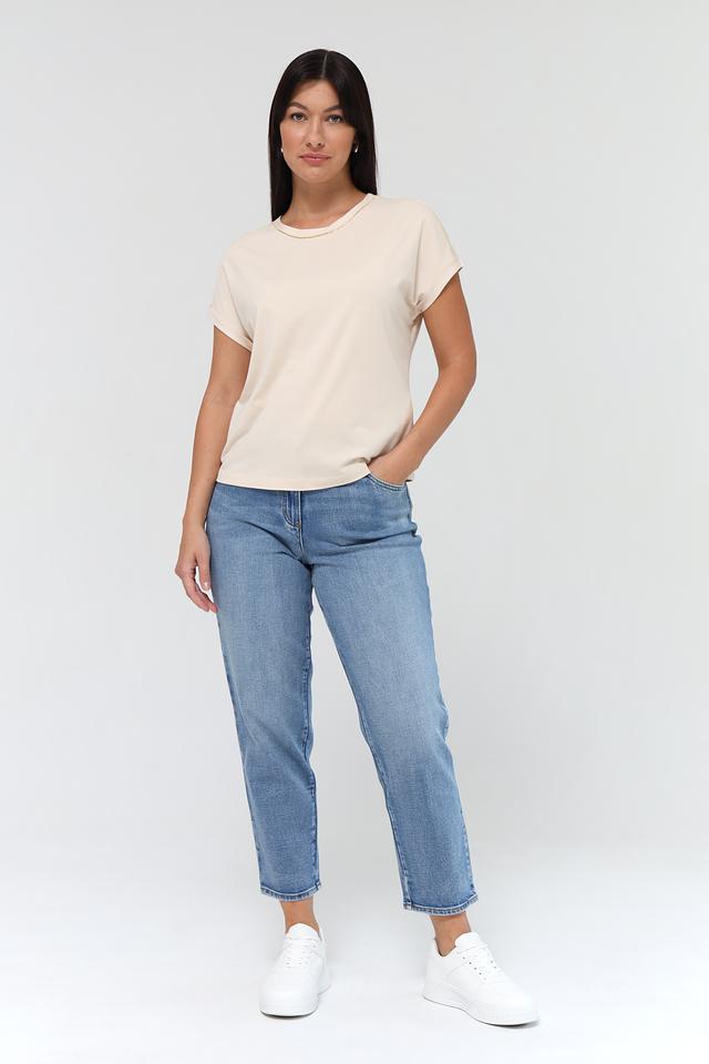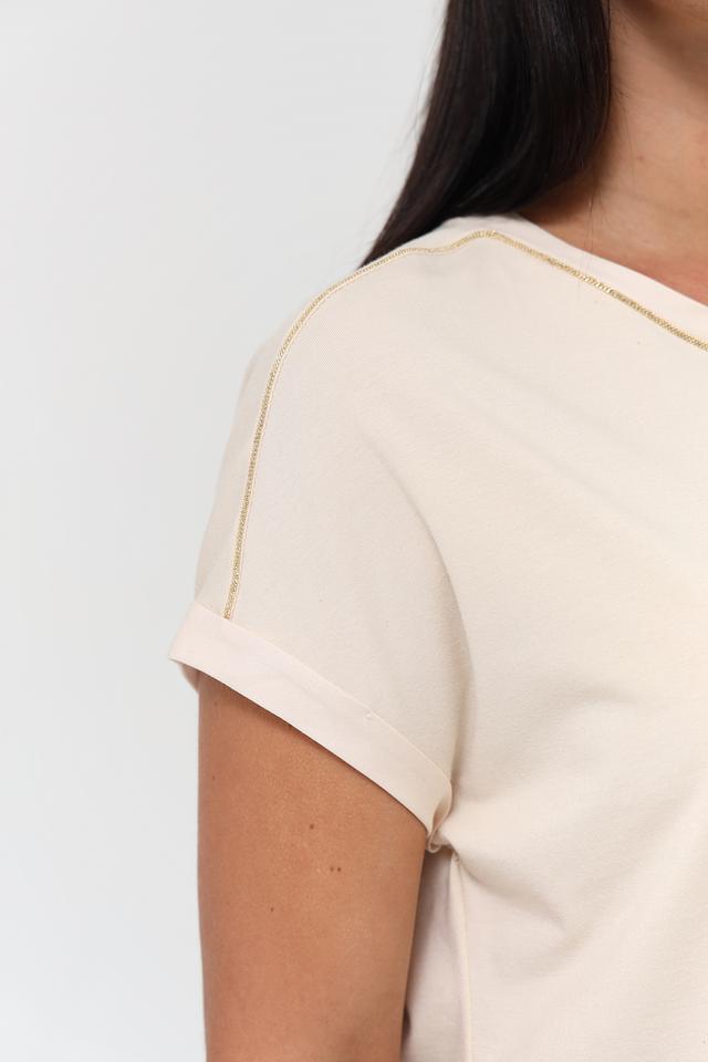 Декоративная отделка в виде золотистой цепочки у горловины придает футболке изысканность и оригинальность. Эта деталь делает модель более интересной и привлекательной.