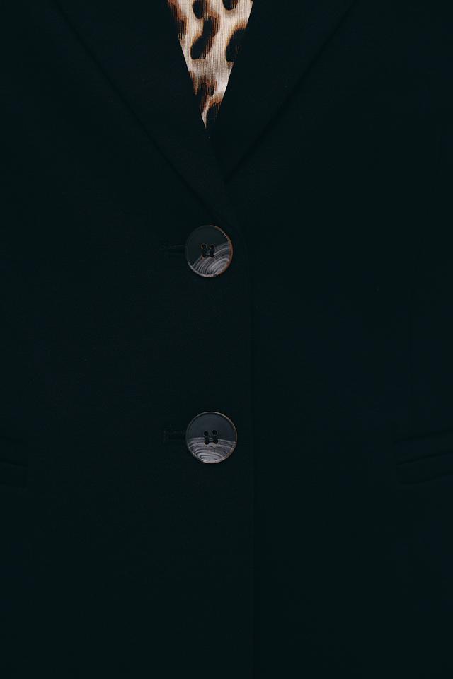 Приталенный силуэт и двубортная застёжка на две пуговицы визуально стройнят и придают образу элегантность. Отделка лацканов и боковых швов лаконична и сдержанна. На подкладке расположены внутренние карманы.