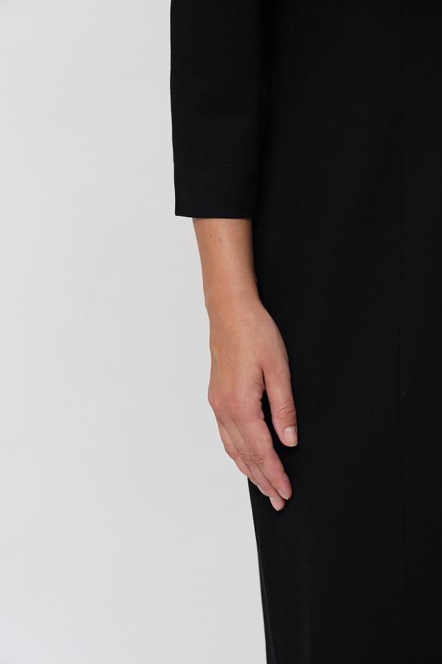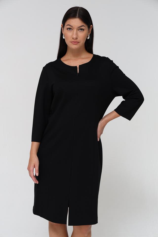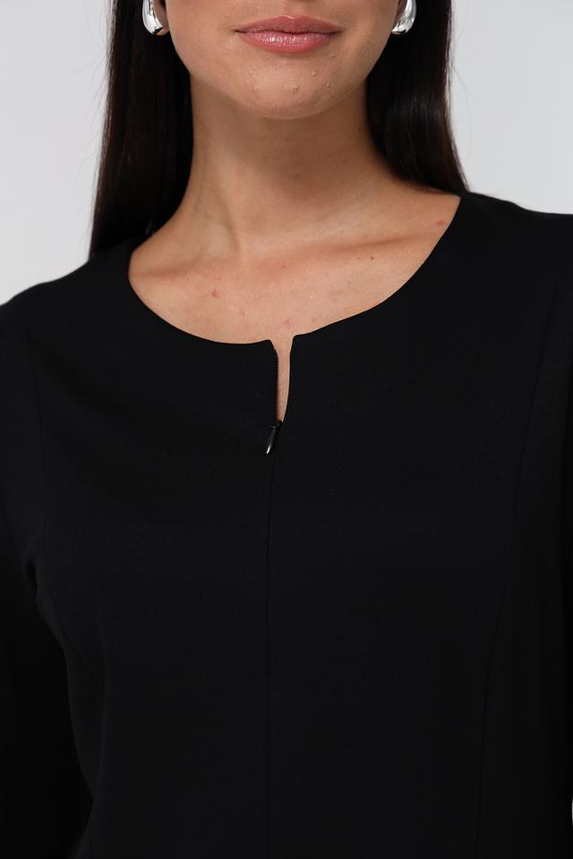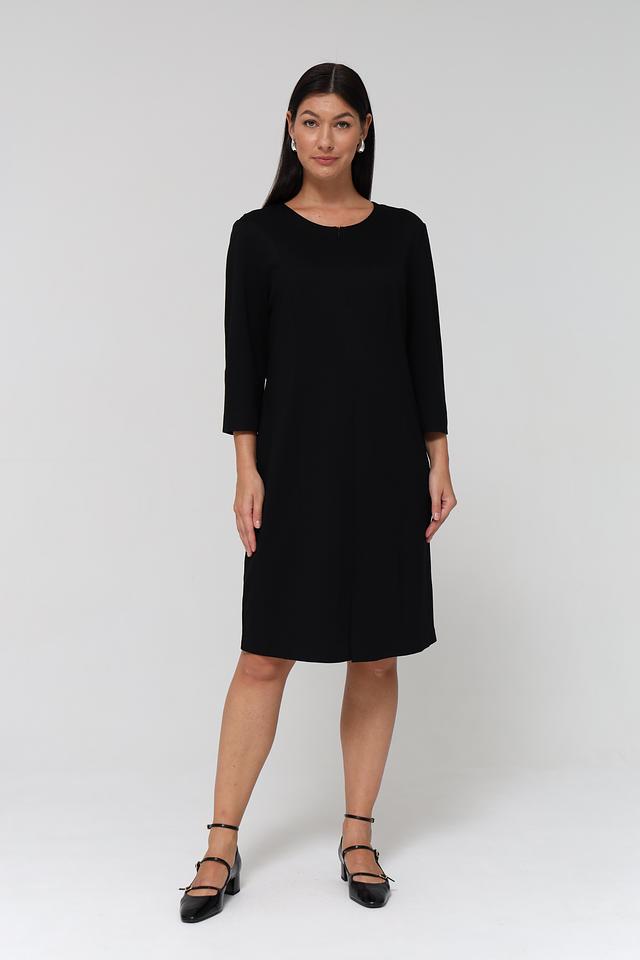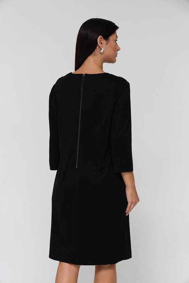 Платье имеет прямой силуэт, длину до колена и рукава три четверти. Небольшой вырез в форме капли на горловине добавляет изысканности образу. Застёжка – потайная молния в боковом шве.
