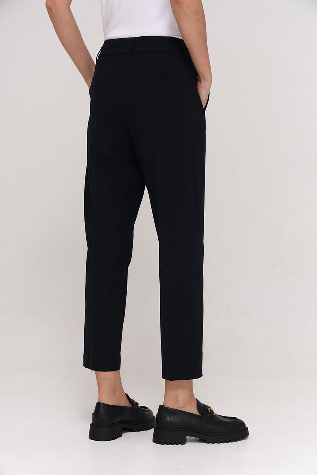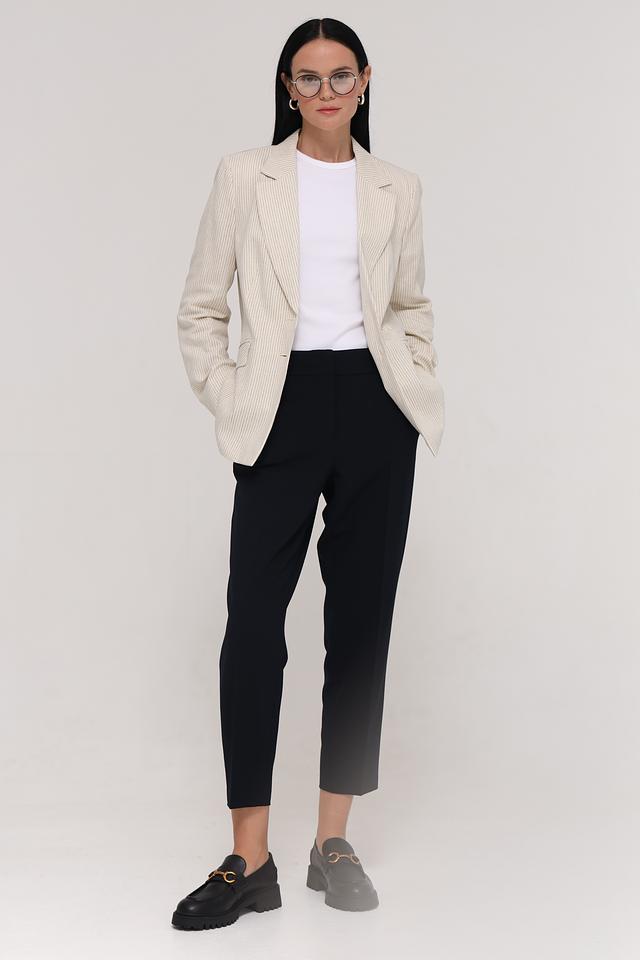 Состав ткани: 66% переработанный полиэстер, 28% вискоза, 6% эластан. Этот микс обеспечивает комфорт в носке, хорошую посадку и лёгкость в уходе. Брюки приятны к телу и хорошо держат форму.