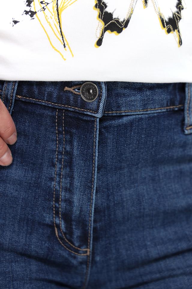 Крой джинсов заужен к низу, что визуально удлиняет ноги и создает современный силуэт. Плотный деним обеспечивает комфорт при носке и гарантирует долговечность изделия. Джинсы имеют стандартную посадку на талии и застегиваются на молнию и пуговицу.
