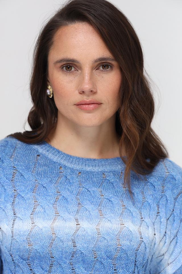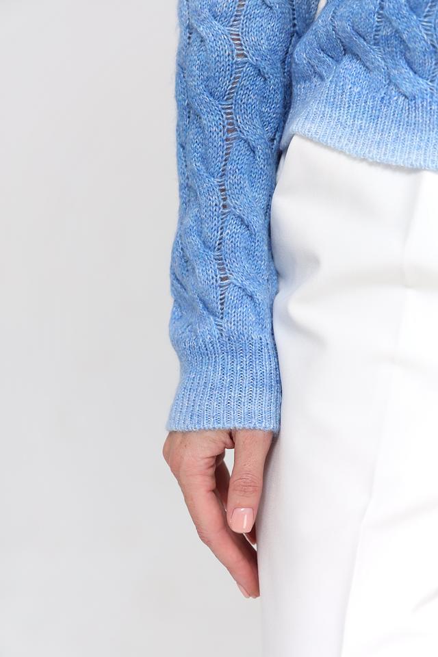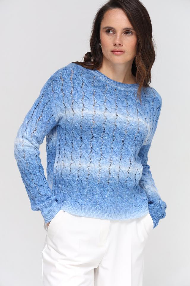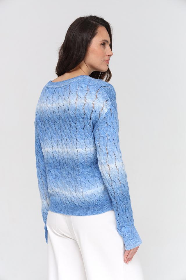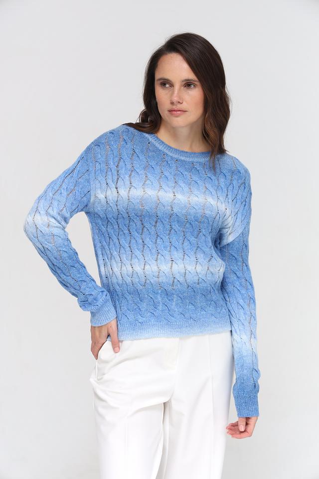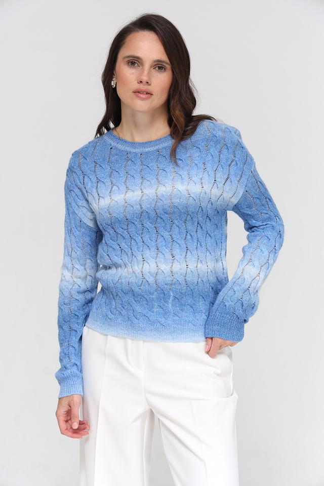 Женский пуловер Gerry Weber голубого цвета с оригинальным узором "омбре" и ажурной вязкой. Изготовлен из мягкой смеси полиакрила и шерсти для комфорта и тепла. Состав: полиакрил 85%, шерсть 15%