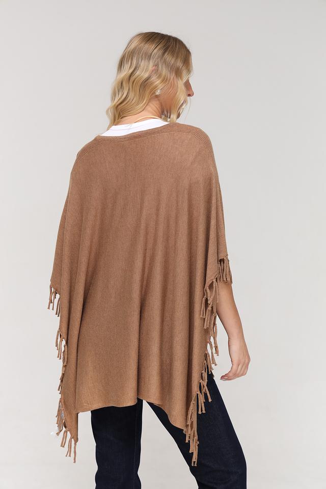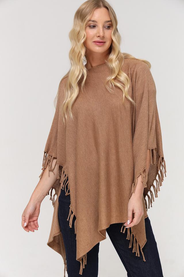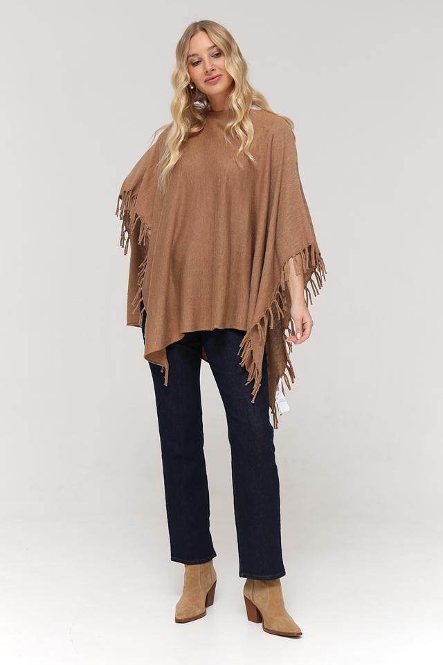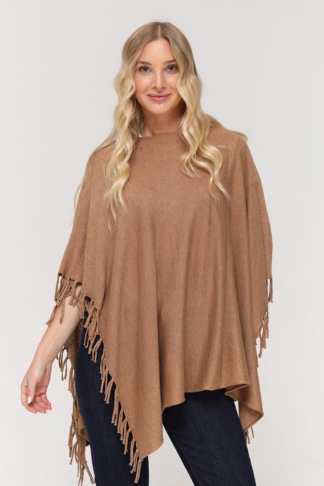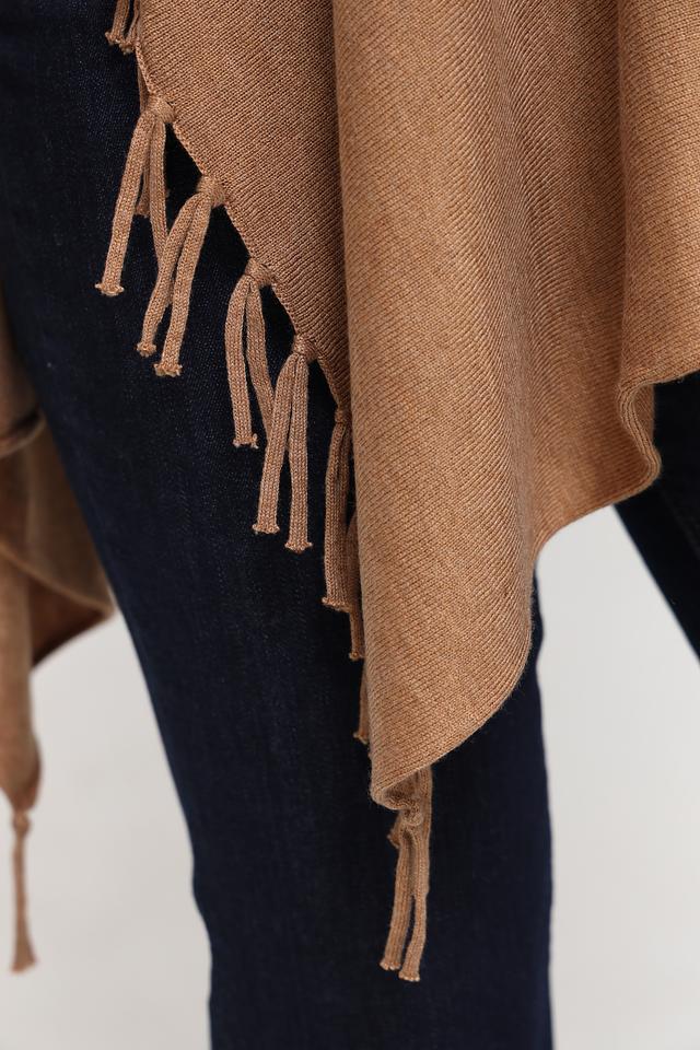 Пончо имеет свободный крой, который обеспечивает комфорт и свободу движений. Декоративная бахрома по краям придает изделию богемный стиль и делает его более привлекательным. Бежевый цвет пончо универсален и легко сочетается с различными элементами одежды.