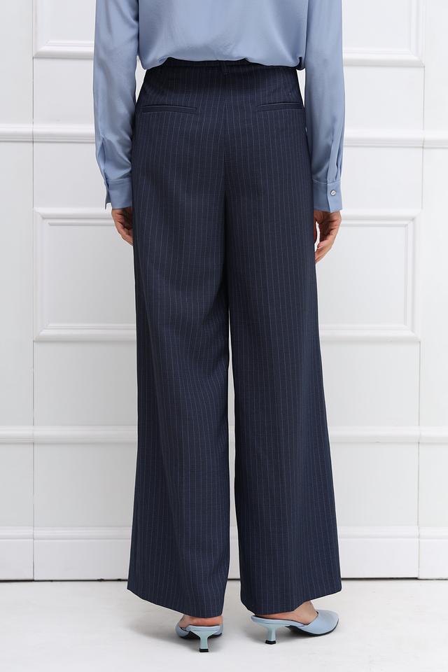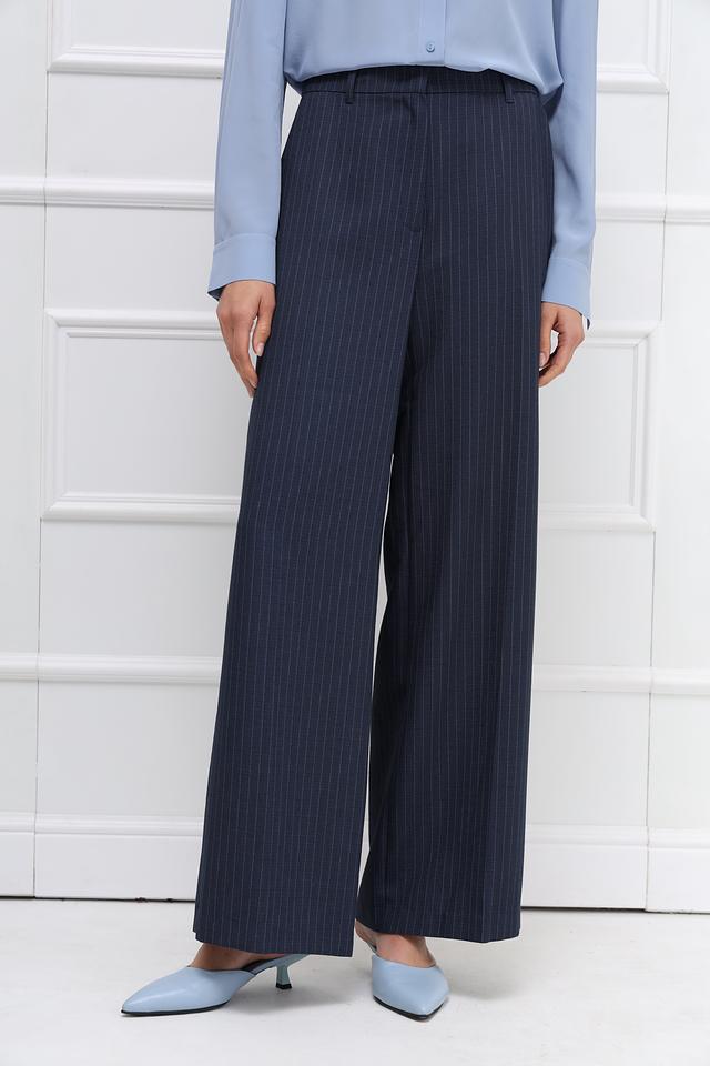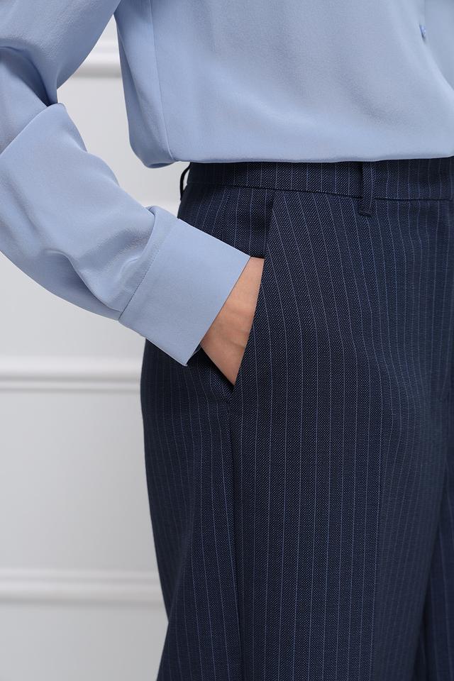 Брюки имеют прямой крой и стандартную посадку по талии. Ткань, состоящая из 77% полиэстера и 23% вискозы, приятна к телу, хорошо держит форму и практически не мнется. Тёмно-синий цвет с тонкой полоской делает эти брюки универсальными и легко сочетаемыми с различными элементами одежды.