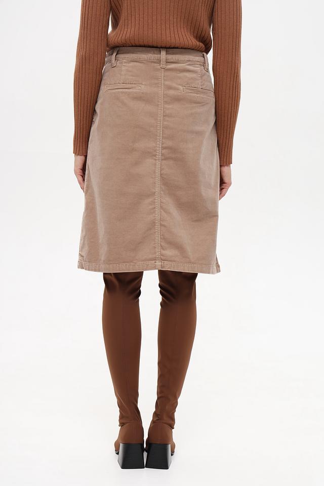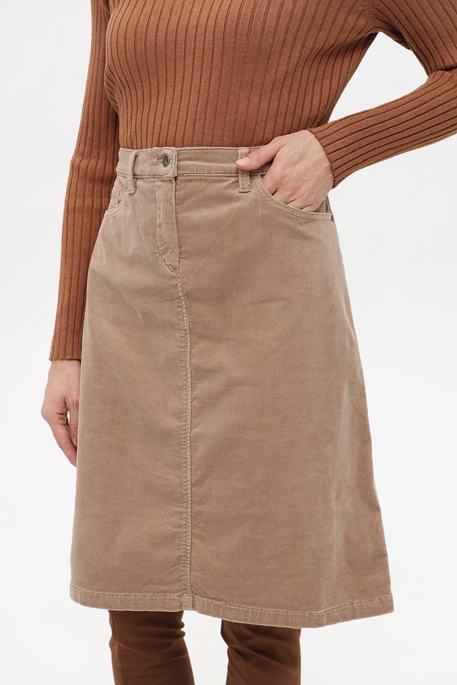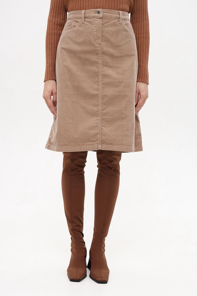 Модель имеет классическую посадку на талии, застежку на молнию и пуговицу, а также функциональные боковые карманы. Вельветовая текстура придает юбке особый шарм и делает ее приятной на ощупь.