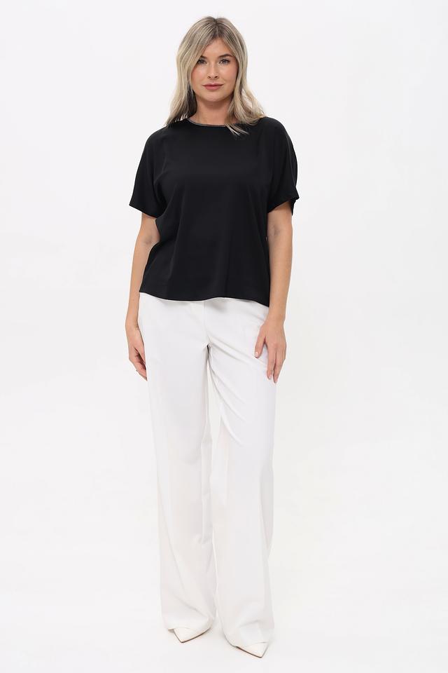 Блуза имеет свободный крой, который обеспечивает комфорт и свободу движений. Округлый вырез горловины декорирован изящной отделкой, придающей образу изысканность.