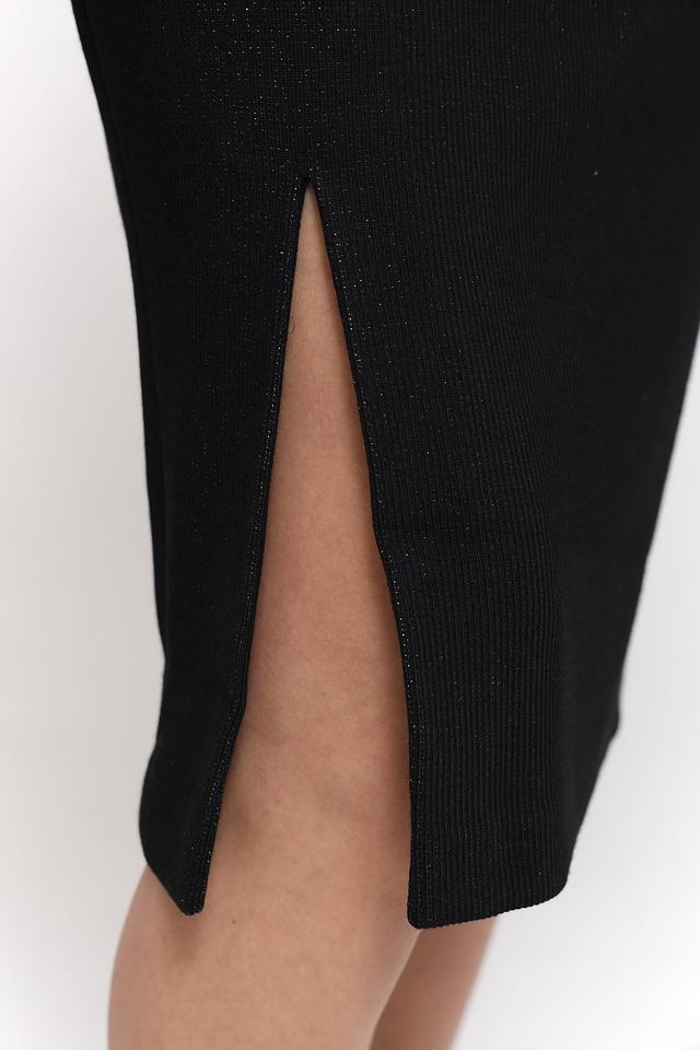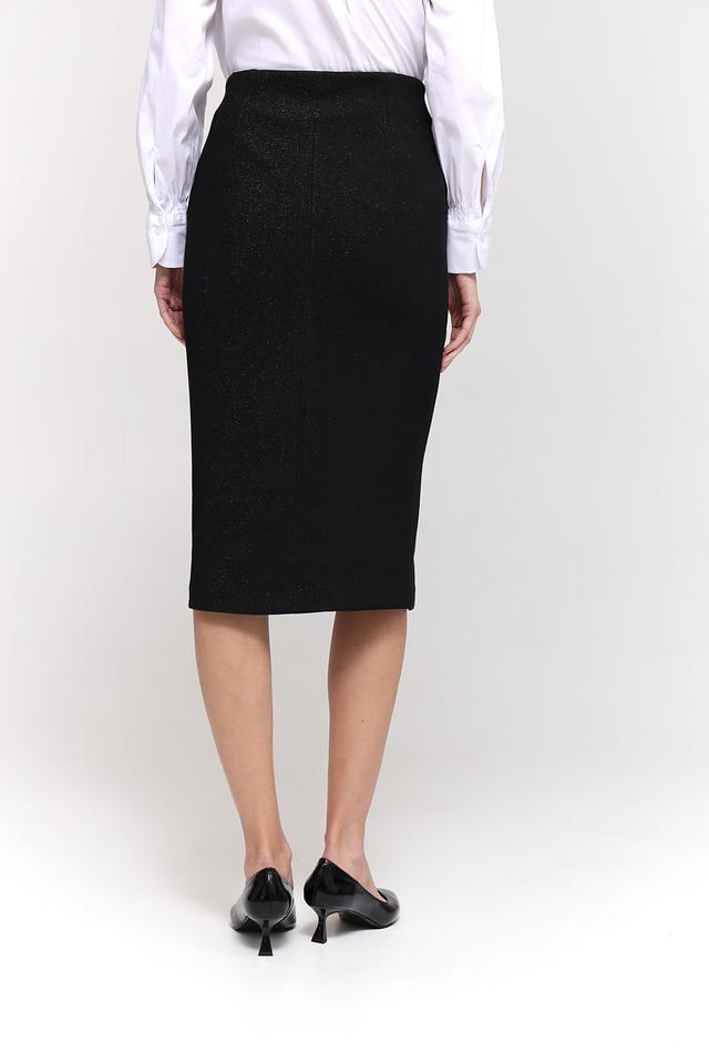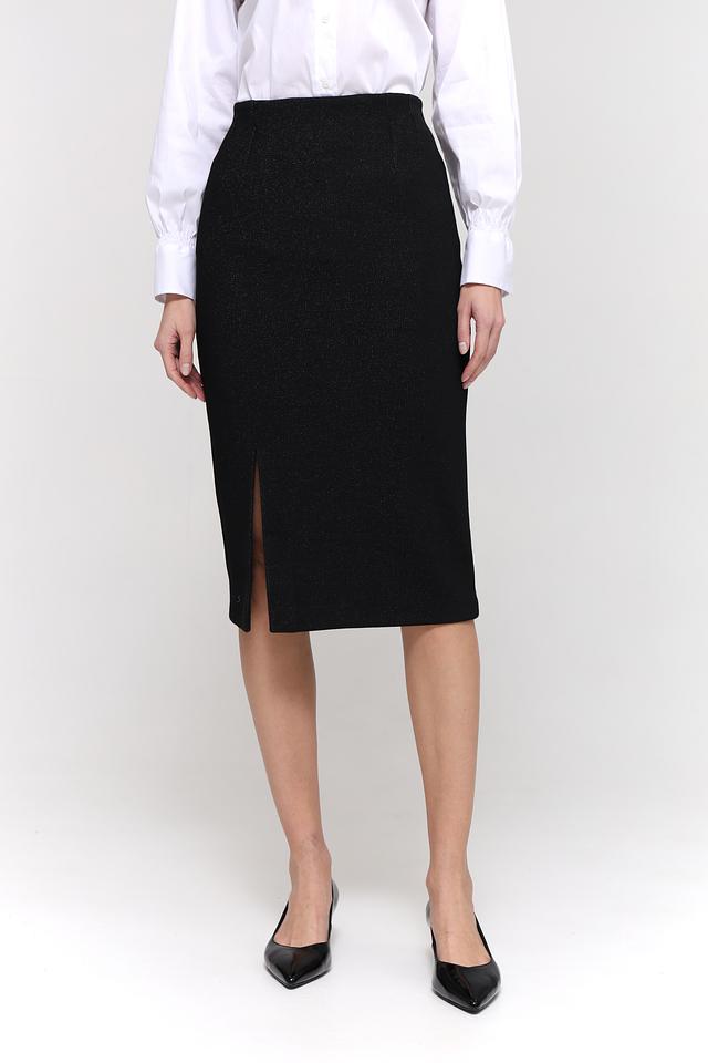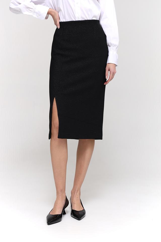Классический чёрный цвет делает эту юбку универсальной и легко сочетаемой с различными элементами гардероба. Прямой крой и длина миди подчеркивают фигуру, а разрез сзади добавляет образу изысканности и динамики.