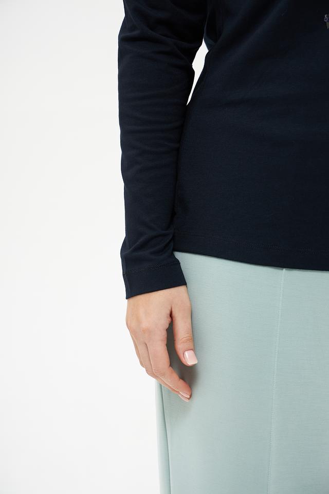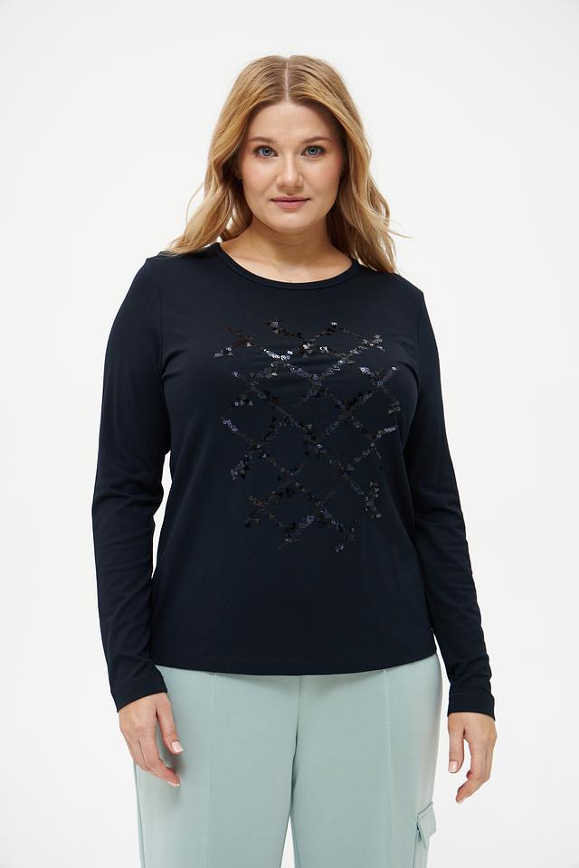 Модель имеет прямой крой и длинные рукава, что делает ее универсальной для разных сезонов. Особенностью футболки является декоративный узор из пайеток, расположенный на передней части, который придает образу изысканность и блеск.