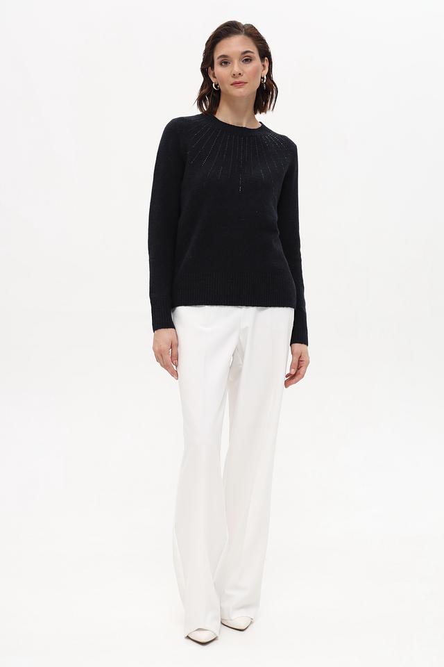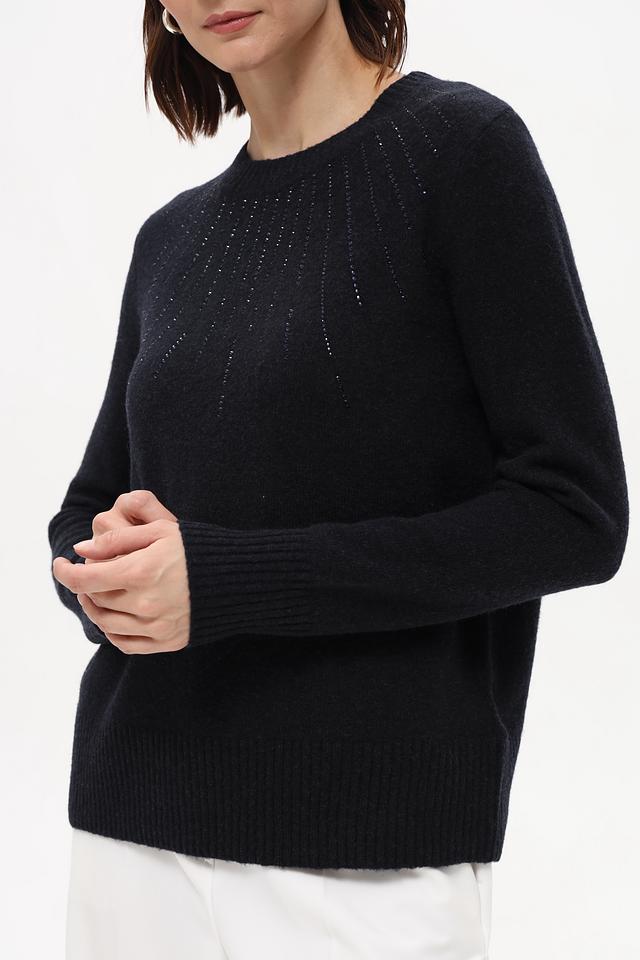 Пуловер имеет классический крой с круглым вырезом горловины и длинными рукавами. Особый акцент сделан на декоративной отделке в области плеч, выполненной в виде мелких страз, которые придают изделию изысканность и блеск.
