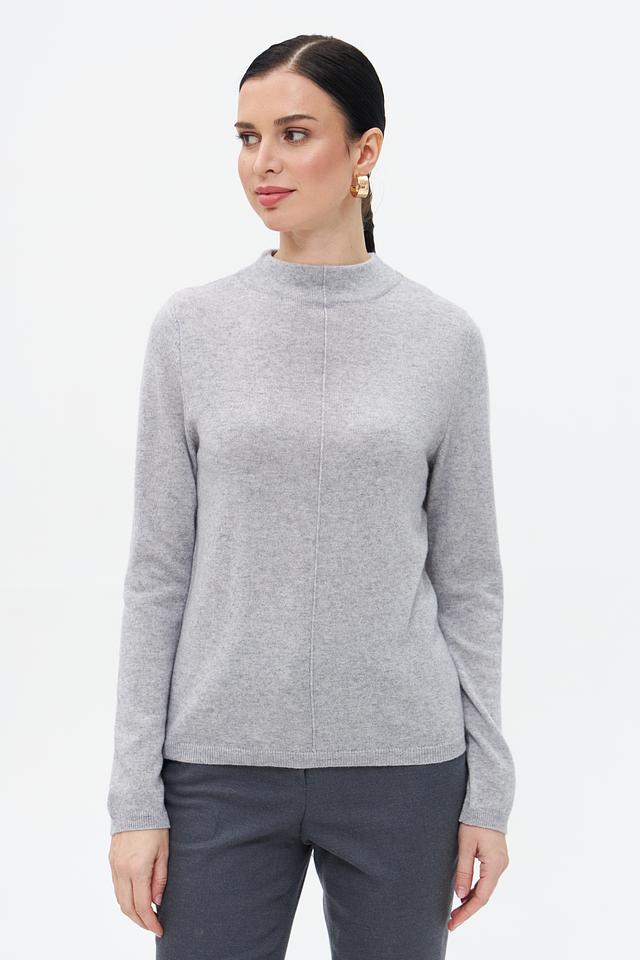 Пуловер имеет классический крой и спокойный серый цвет, который легко сочетается с различными элементами одежды. Высокий воротник-стойка добавляет изысканности образу. Деликатная текстура вязки подчеркивает качество изделия.