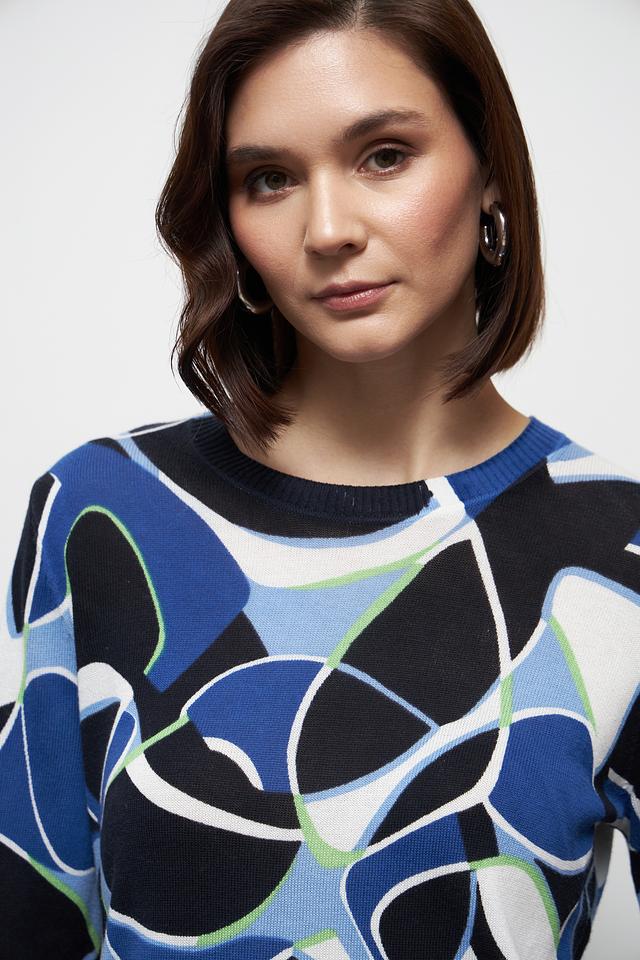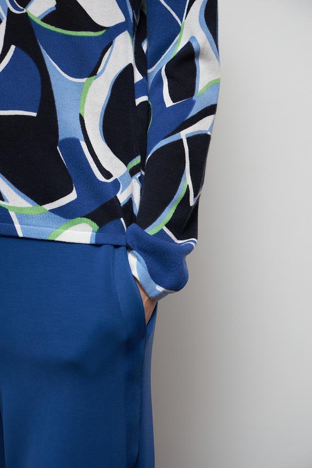 Пуловер имеет свободный крой и круглый вырез горловины, что делает его универсальным и подходящим для различных образов. Главной особенностью модели является яркий и необычный абстрактный принт, выполненный в синих, голубых и зелёных тонах. Этот принт добавляет изделию оригинальности и привлекает внимание.