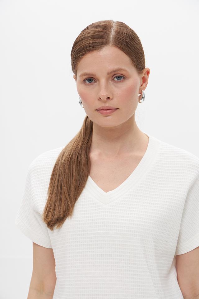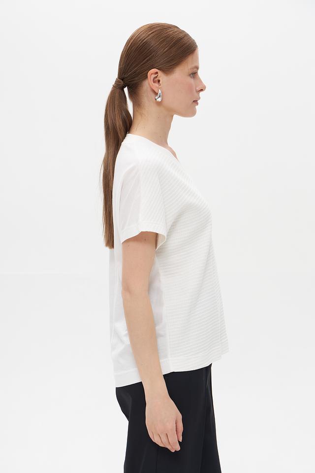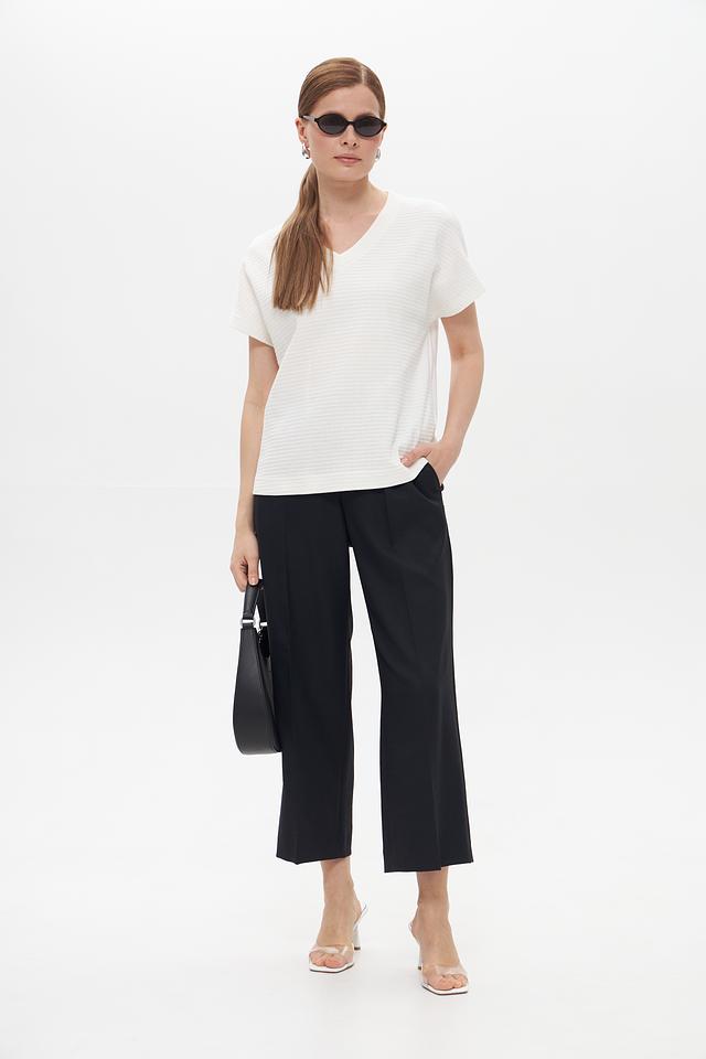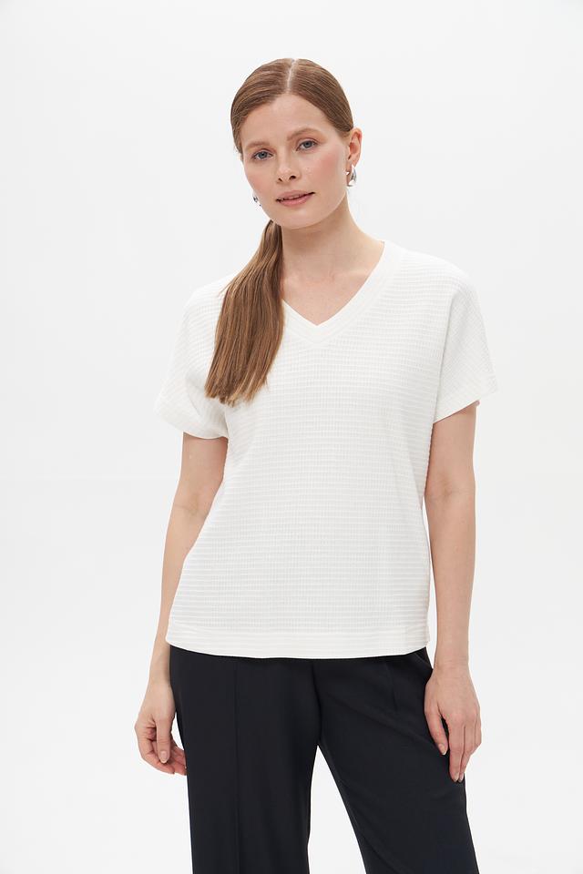 Футболка имеет классический V-образный вырез, который визуально удлиняет шею и делает силуэт более изящным. Текстурированная фактура ткани придает изделию особый шарм и оригинальность.