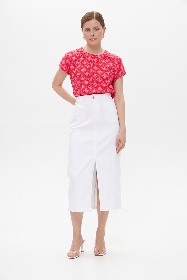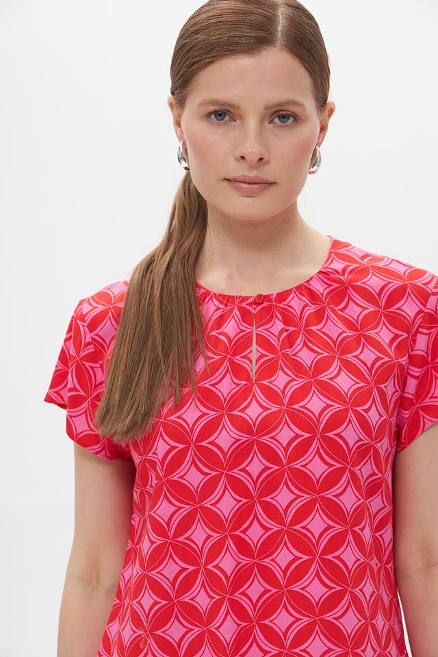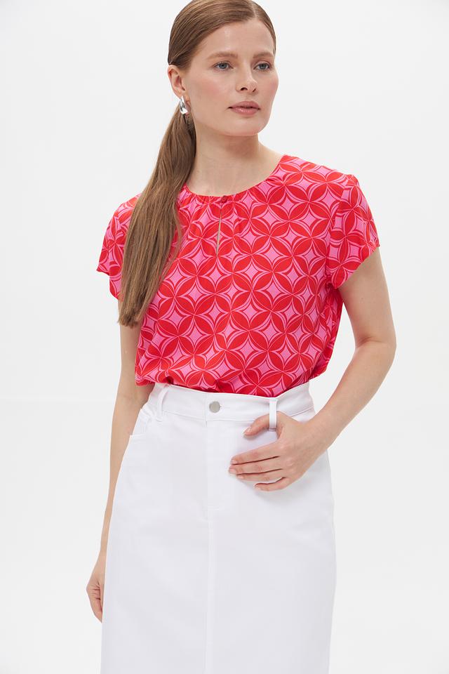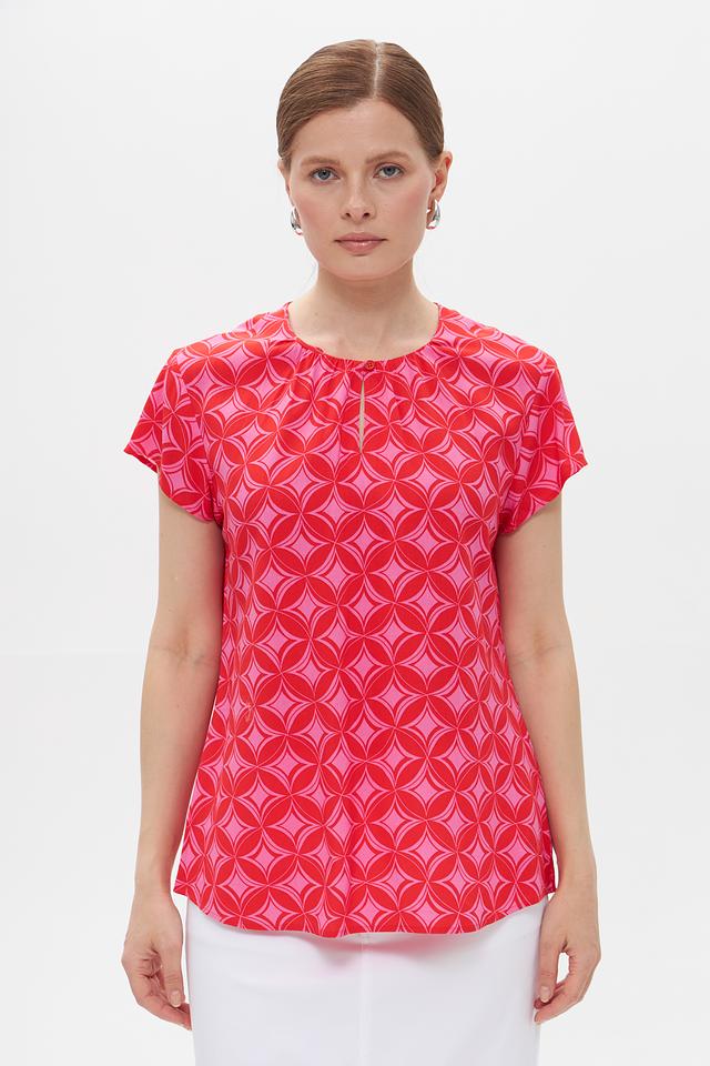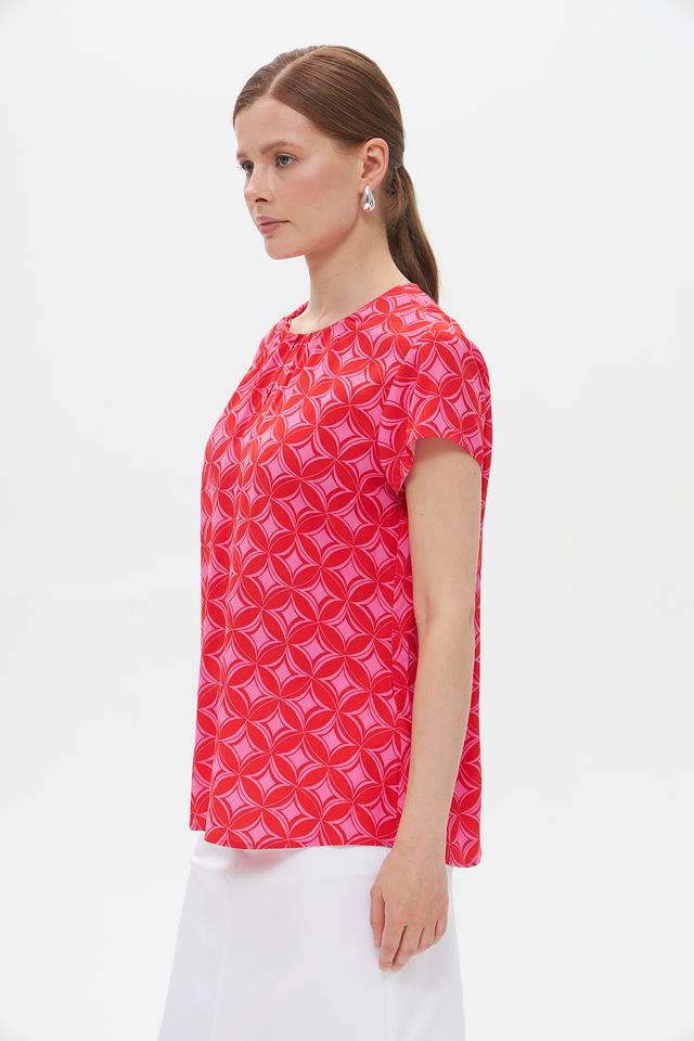 Блузка имеет яркий геометрический принт в розово-красной гамме, который добавит образу оригинальности. Короткие рукава и круглый вырез горловины делают её идеальной для теплой погоды.