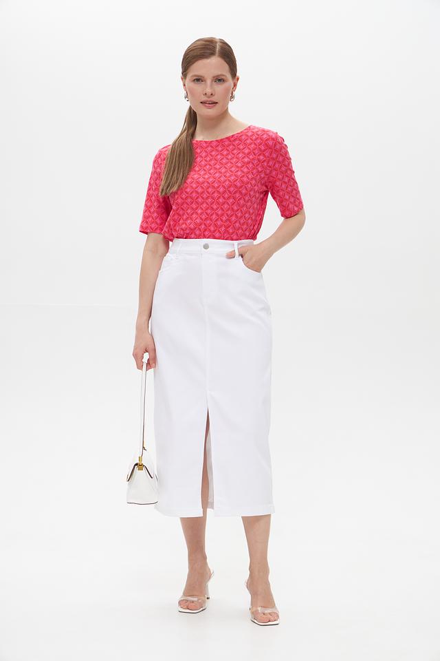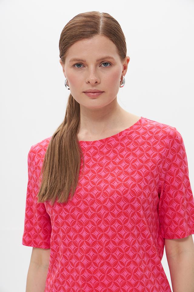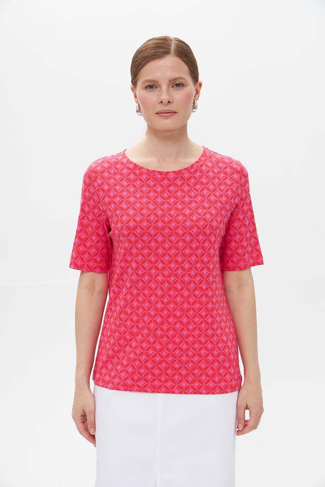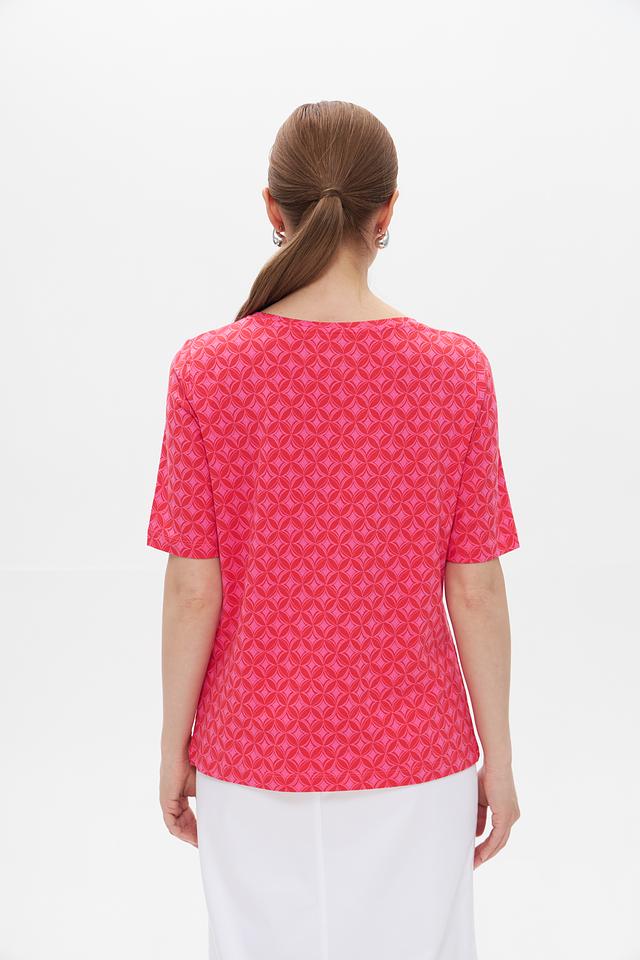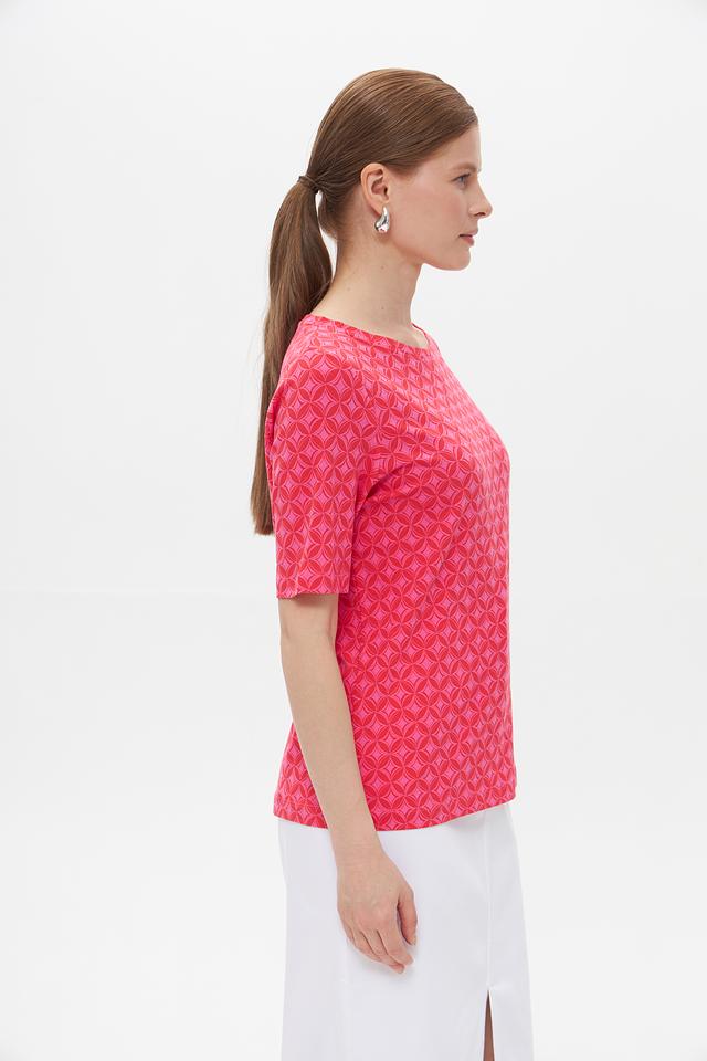 Розовая футболка Gerry Weber EDITION с оригинальным геометрическим принтом. Изготовлена из мягкого, приятного к телу трикотажа с добавлением модала и эластана. Состав: хлопок 47%, модал 47%, эластан 6%