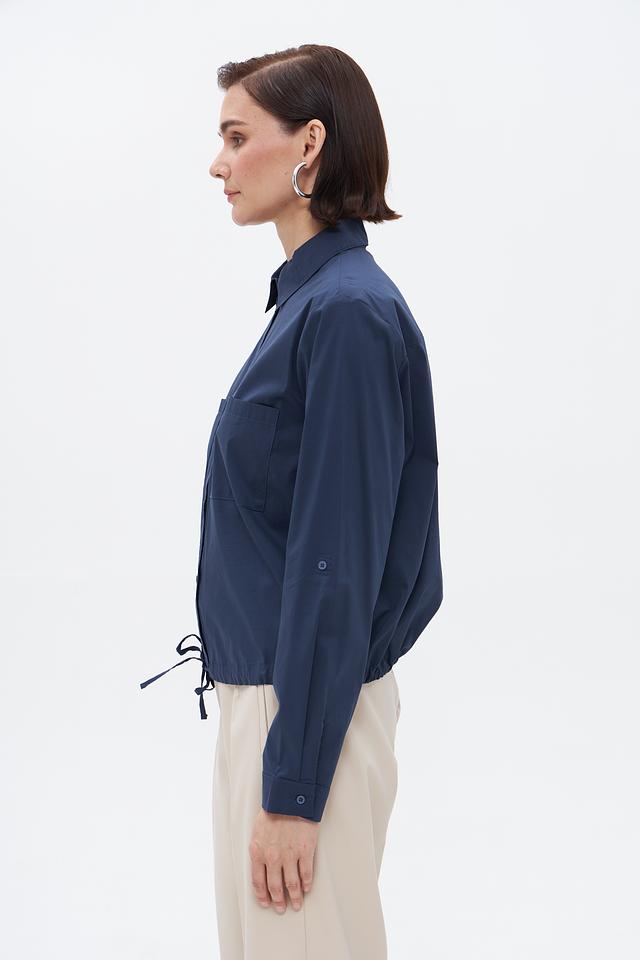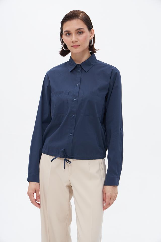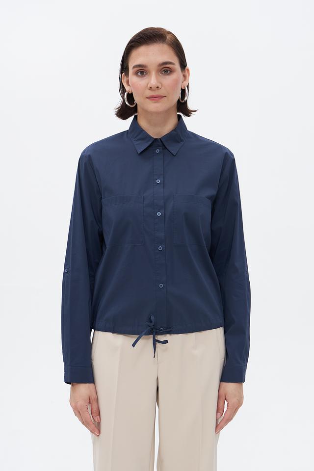 Блузка имеет классический крой с длинными рукавами и воротником. На полочке расположены накладные карманы, добавляющие образу непринужденности. Боковые завязки позволяют регулировать посадку по фигуре, подчеркивая талию.