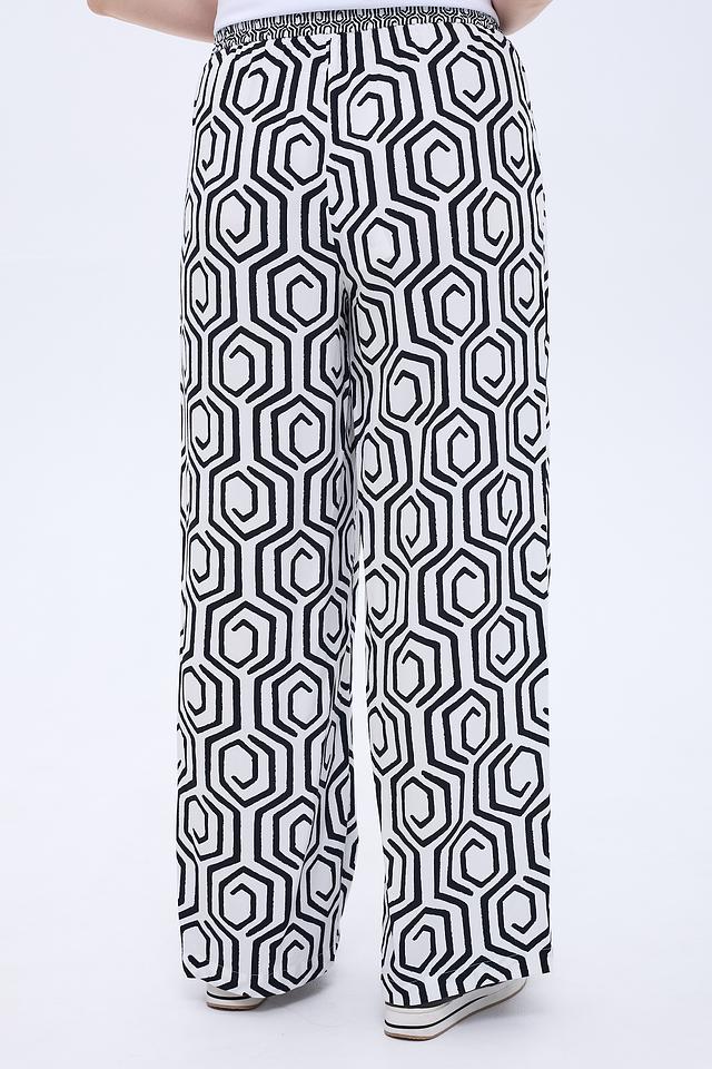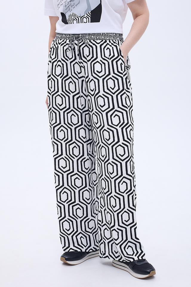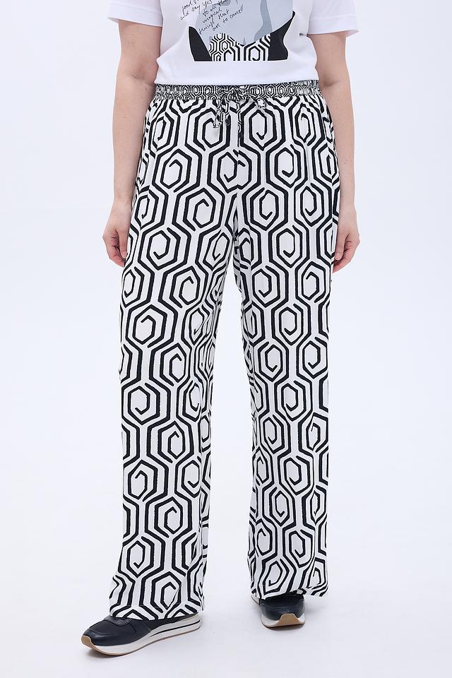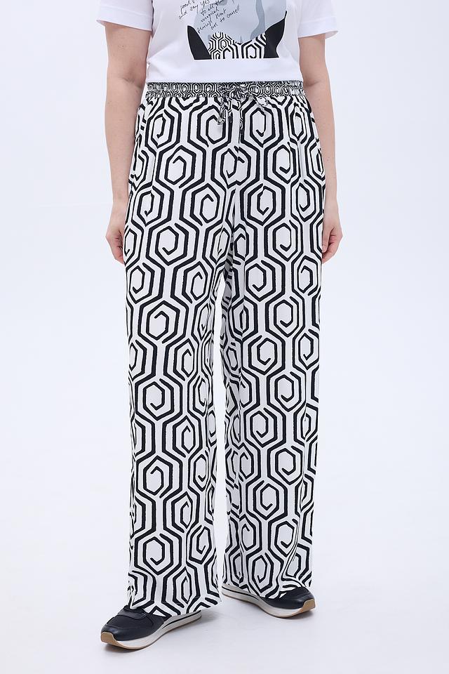 Основной цвет брюк – белый, украшен эффектным чёрным геометрическим принтом. Такой рисунок придаёт изделию современный и динамичный вид. Брюки изготовлены из высококачественной 100% вискозы, которая приятна к телу, хорошо драпируется и обеспечивает отличную воздухопроницаемость.