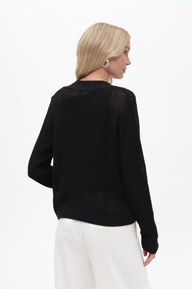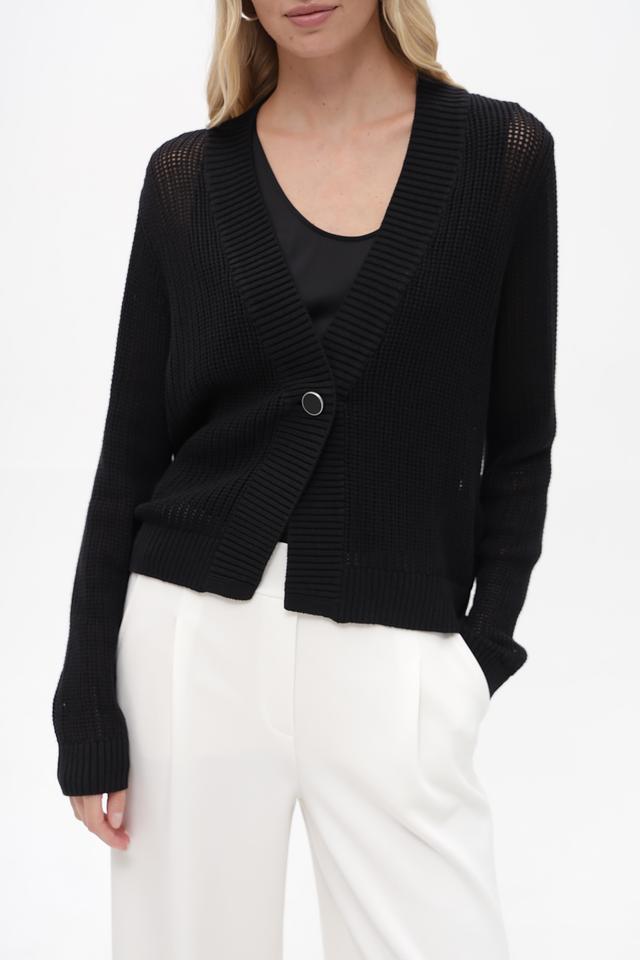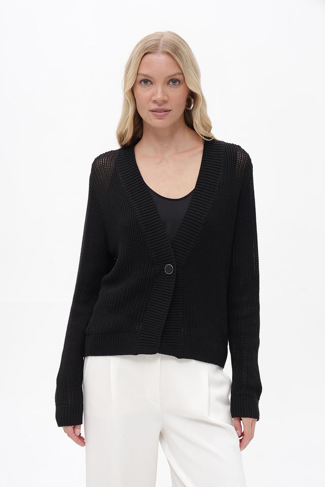 Жакет имеет классический крой с V-образным вырезом и длинными рукавами. Застёжка на одну пуговицу позволяет регулировать силуэт. Текстурный вязаный узор добавляет изделию изысканности.