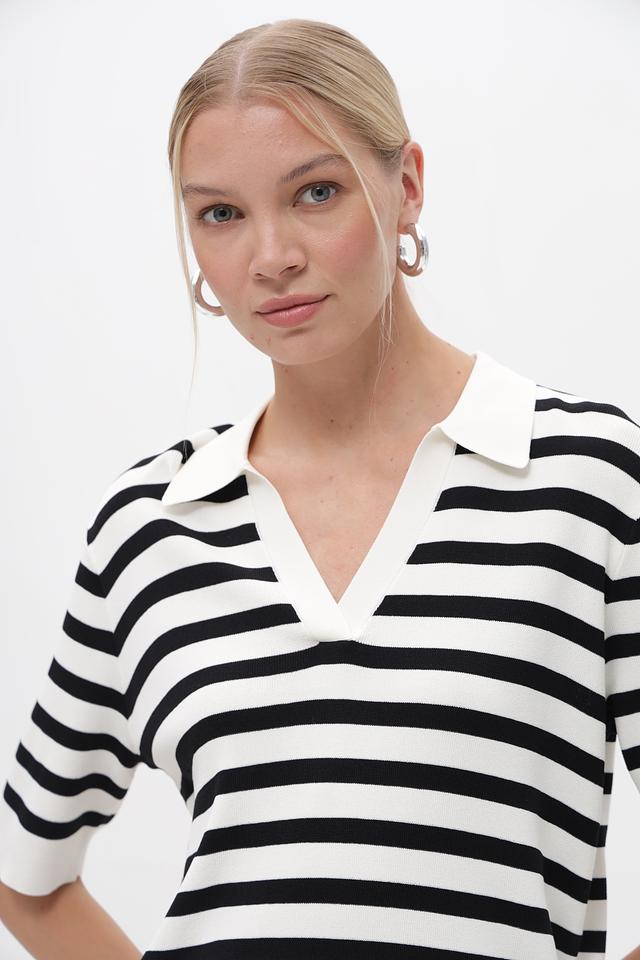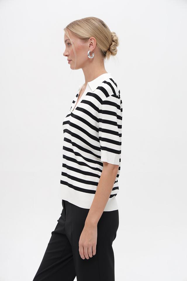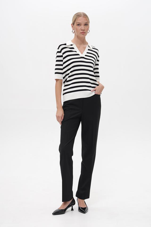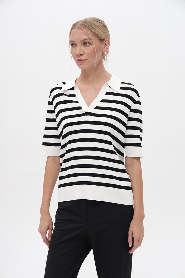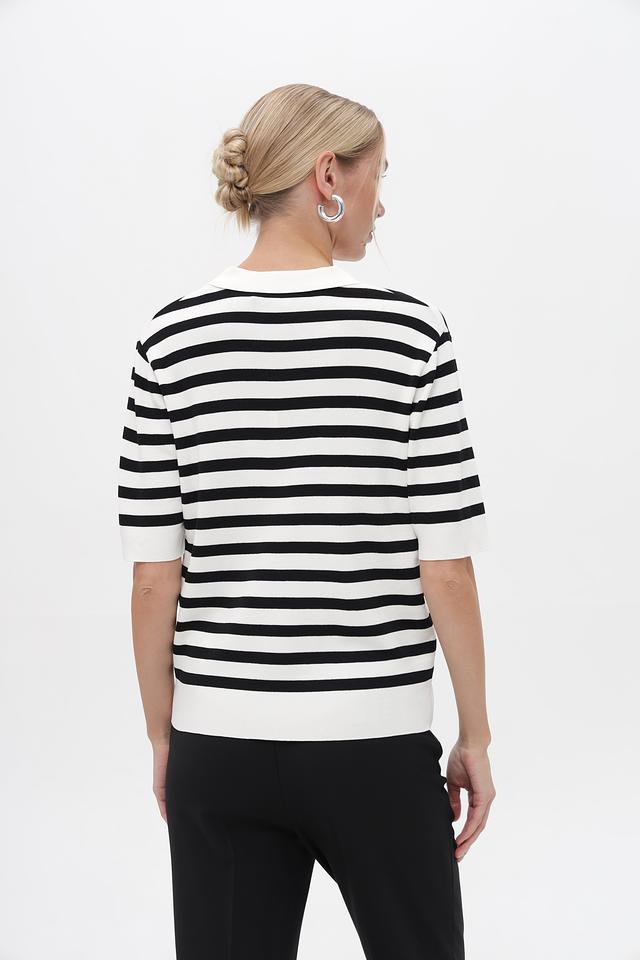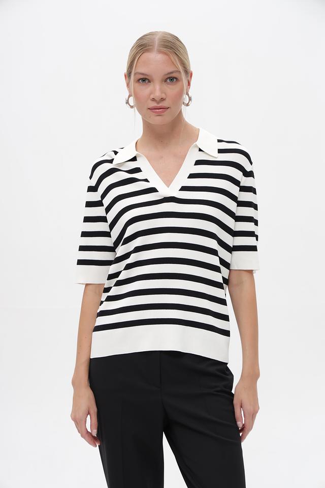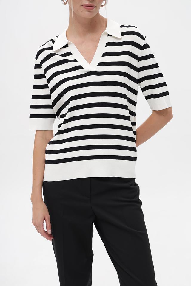 Женский пуловер Gerry Weber белого цвета с классическим черным рисунком в полоску. Модель выполнена из мягкой вискозы с добавлением полиамида, отличается удобным кроем и воротником поло. Состав: вискоза 65%, полиамид 35%