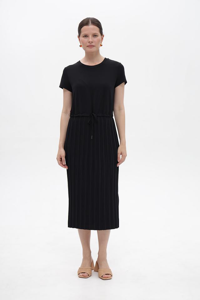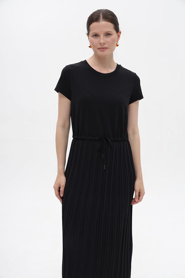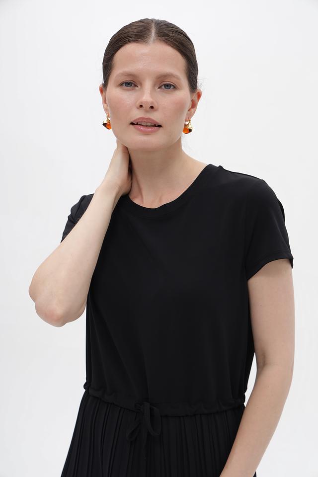 Чёрное платье от Gerry Weber с плиссированной юбкой и завязками на талии. Модель выполнена из полиэстера с добавлением эластана, обеспечивающего комфорт в носке и хорошую посадку по фигуре. Состав: полиэстер 95%, эластан 5%