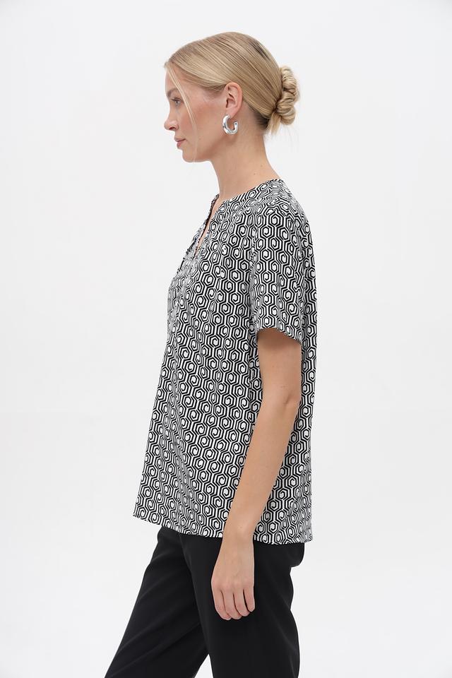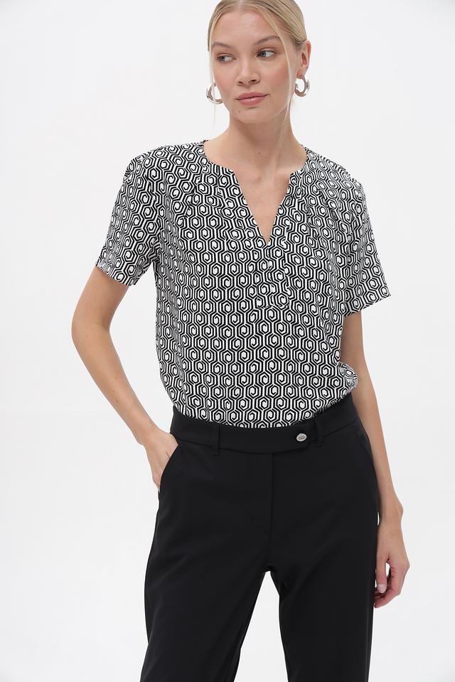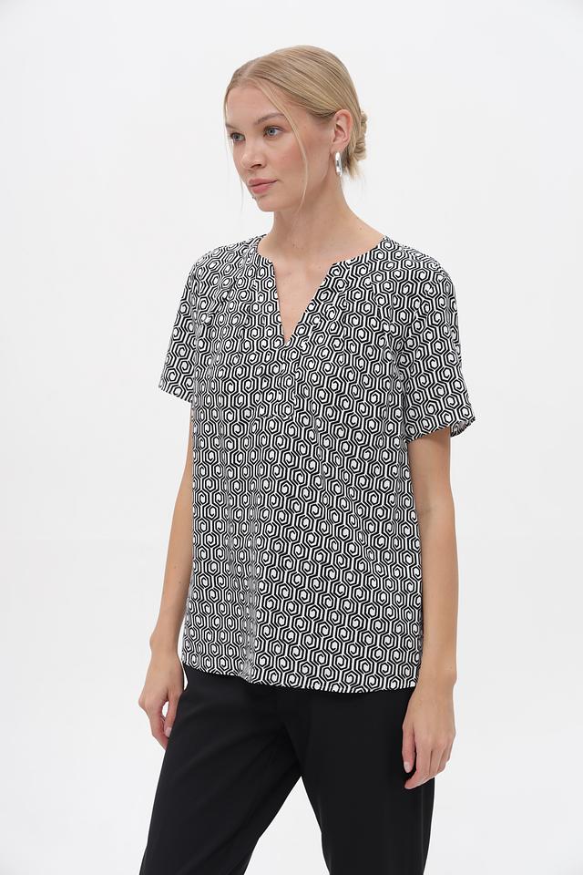 Женская блузка Gerry Weber станет стильным дополнением к вашему гардеробу. Выполнена в белом цвете с эффектным геометрическим принтом в чёрном цвете, который придает образу изысканность.
