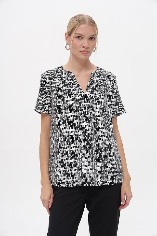 Модель имеет V-образный вырез и короткий рукав, что делает её удобной и универсальной. Блузка изготовлена из высококачественной 100% вискозы, обладающей приятной на ощупь текстурой и обеспечивающей комфорт в течение всего дня.