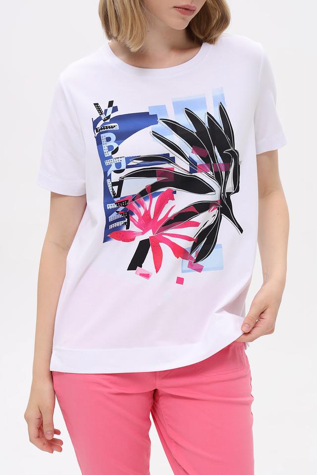 Белая футболка Gerry Weber с ярким тропическим принтом. Изготовлена из мягкого хлопка с добавлением эластана для комфортной посадки и свободы движений. Состав: хлопок 94%, эластан 6%