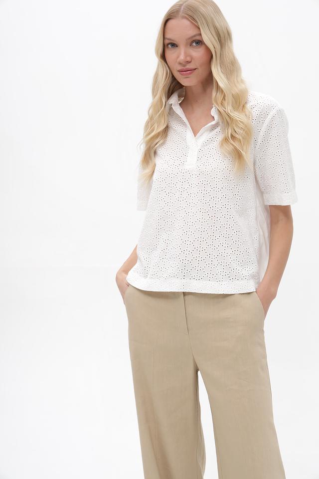 Блузка имеет свободный крой, короткие рукава и воротник-стойку с V-образным вырезом. Особенностью модели является ажурная вышивка, придающая ей лёгкость и изысканность.