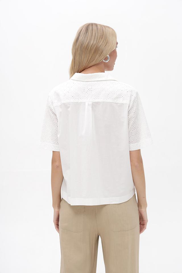 Блузка выполнена в белом цвете, который легко комбинируется с другими цветами и аксессуарами. Качество пошива и используемых материалов гарантирует долговечность изделия.