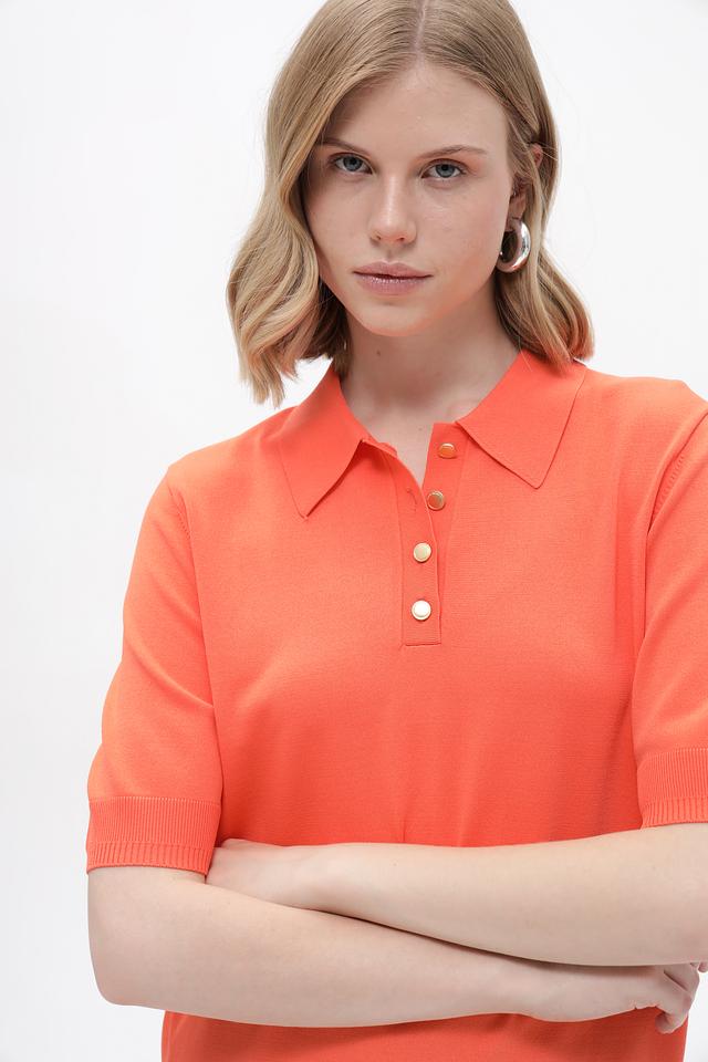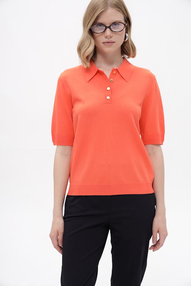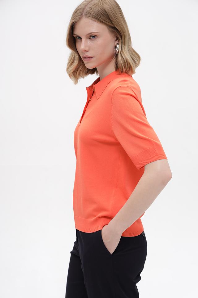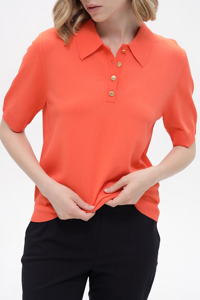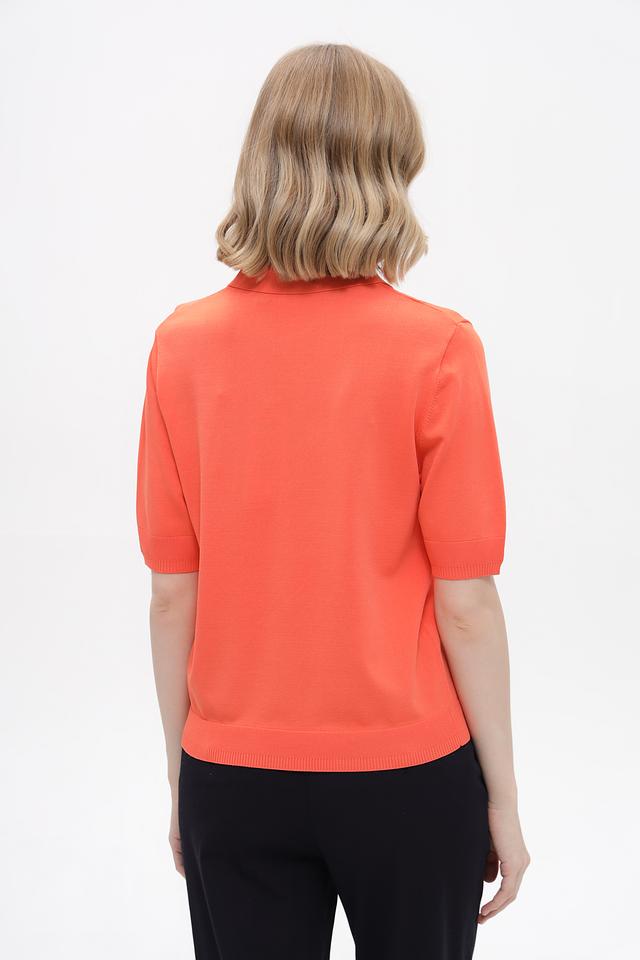 Коралловый пуловер от Gerry Weber с короткими рукавами и воротником-поло. Изготовлен из мягкой вискозы с добавлением полиамида и эластана для комфорта и сохранения формы. Состав: вискоза 64%, полиамид 33%, эластан 3%
