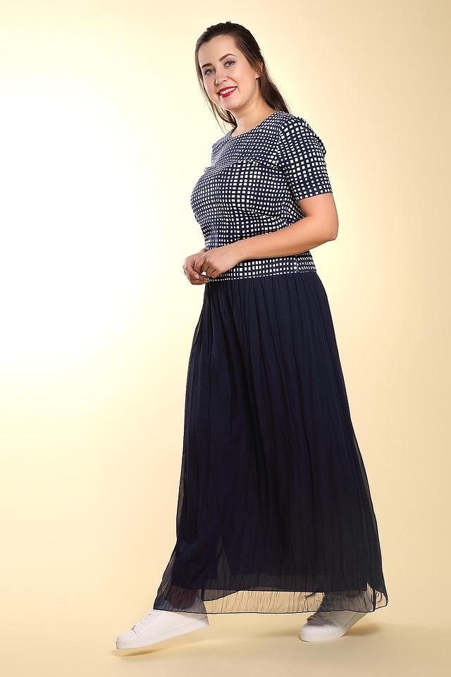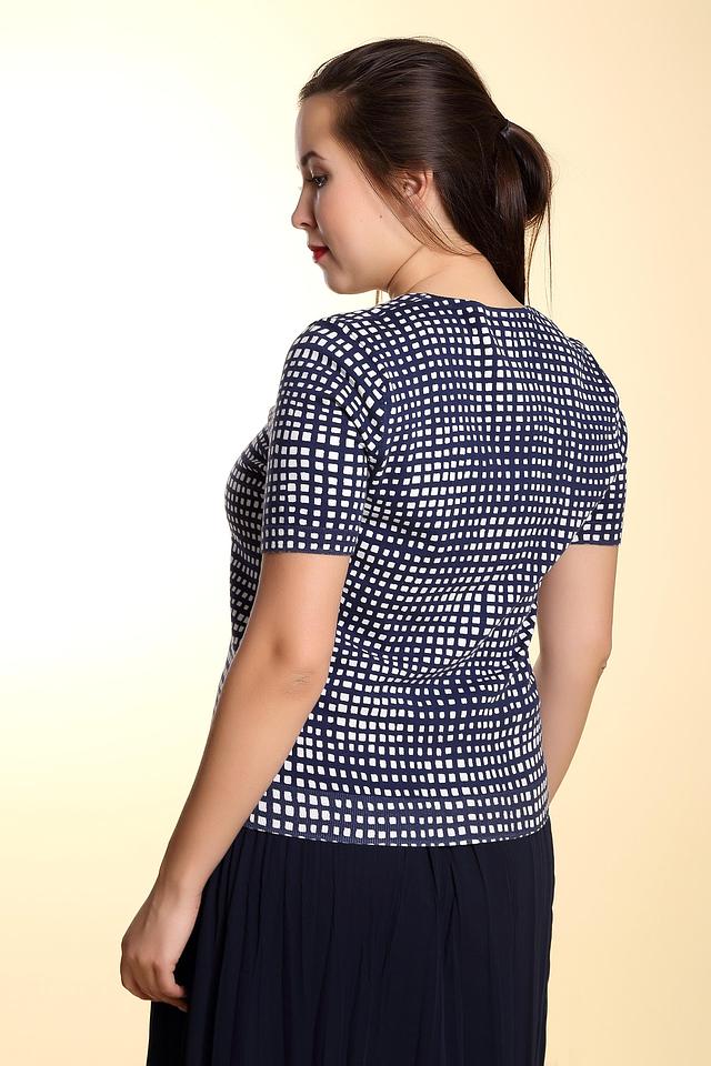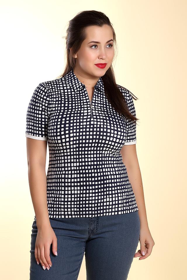 Поло имеет классический крой, короткие рукава и воротник с молнией. Особенностью модели является оригинальный принт в клетку, выполненный в синих и белых тонах. Такой рисунок добавляет образу динамичности и свежести.