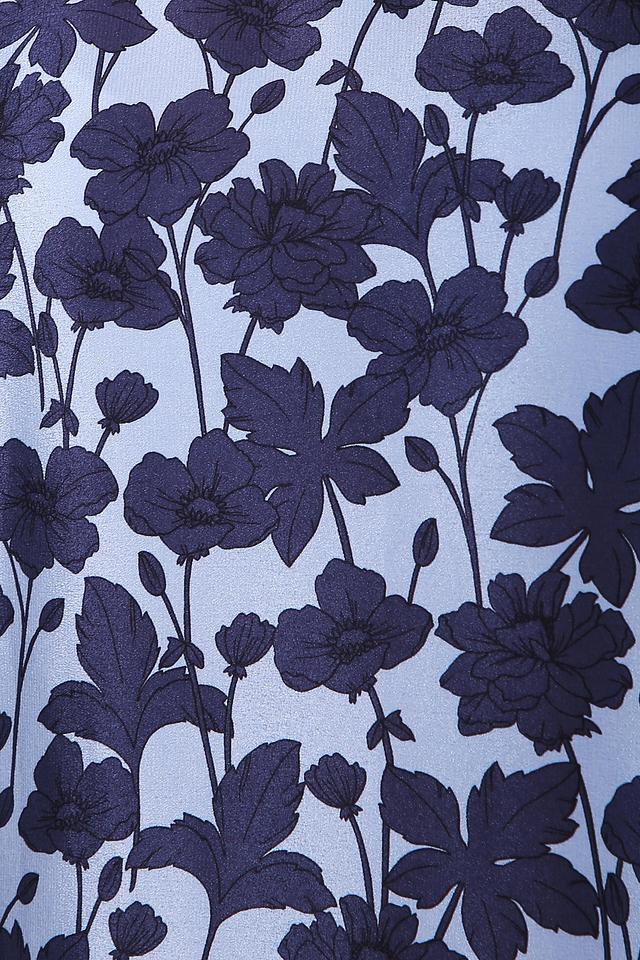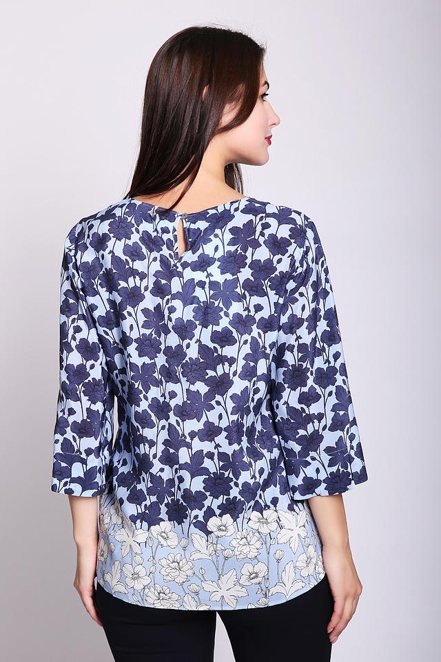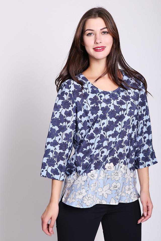Основной цвет блузы – нежный голубой, который служит идеальным фоном для яркого цветочного принта. Принт выполнен в темно-синих и белых тонах, создавая контрастный и привлекательный образ.