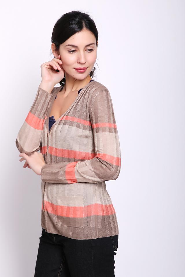 Жакет коричневого цвета фирмы Gerry Weber. Ткань состоит из 48% вискозы и 52% полиэстера. Модель выполнена прямым покроем. Жакет дополнен воротом с V - образным вырезом, застежка на пуговицы, пришивные карманы, длинными, втачными рукавами. Модель имеет полосатый принт. Жакет удлинённого фасона. Эффектно смотрится с брюками.